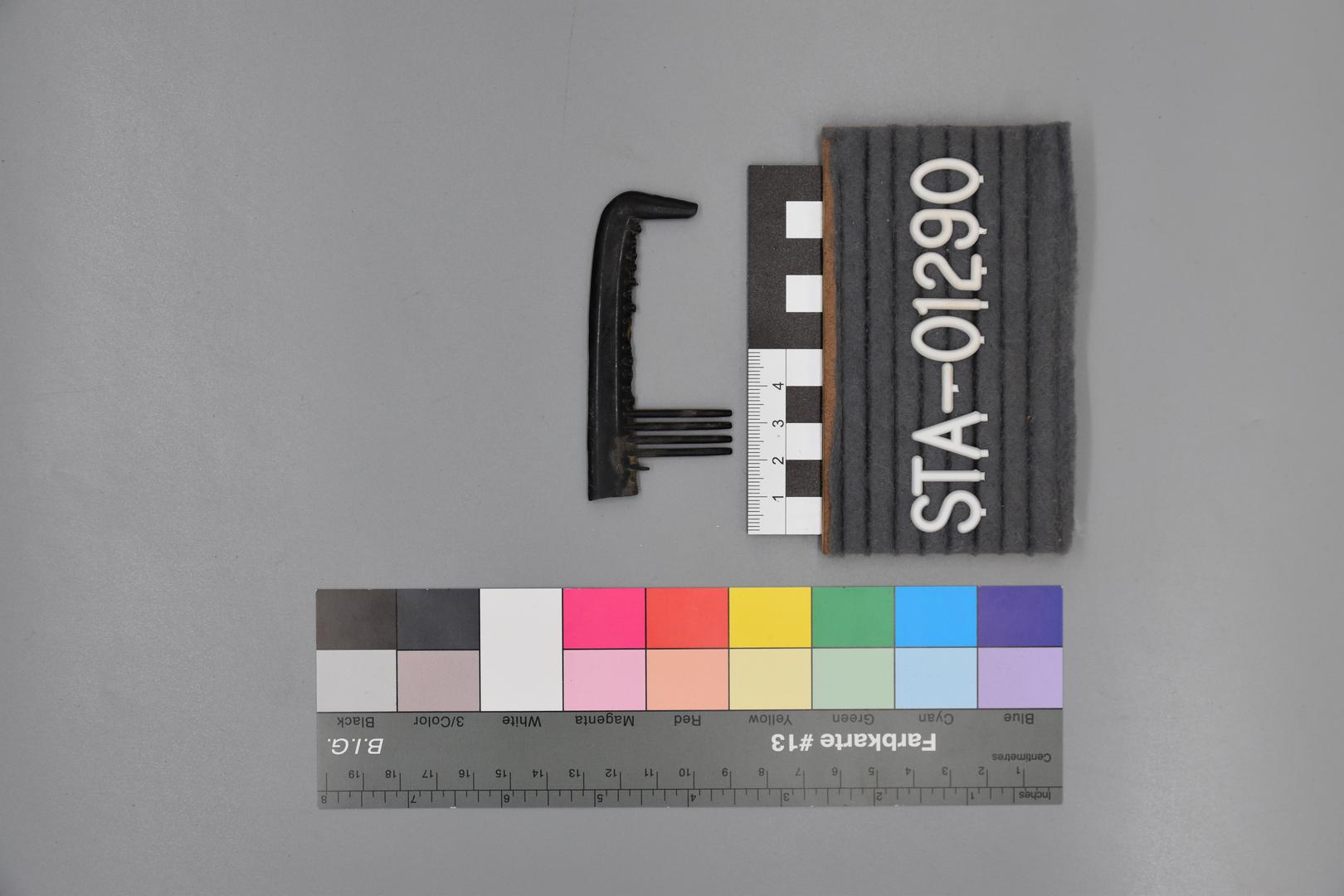 Der rechteckige schwarze Kamm besitzt nur mehr ein Ende, dass dicker ist als die noch erhaltenen vier Kammzacken.