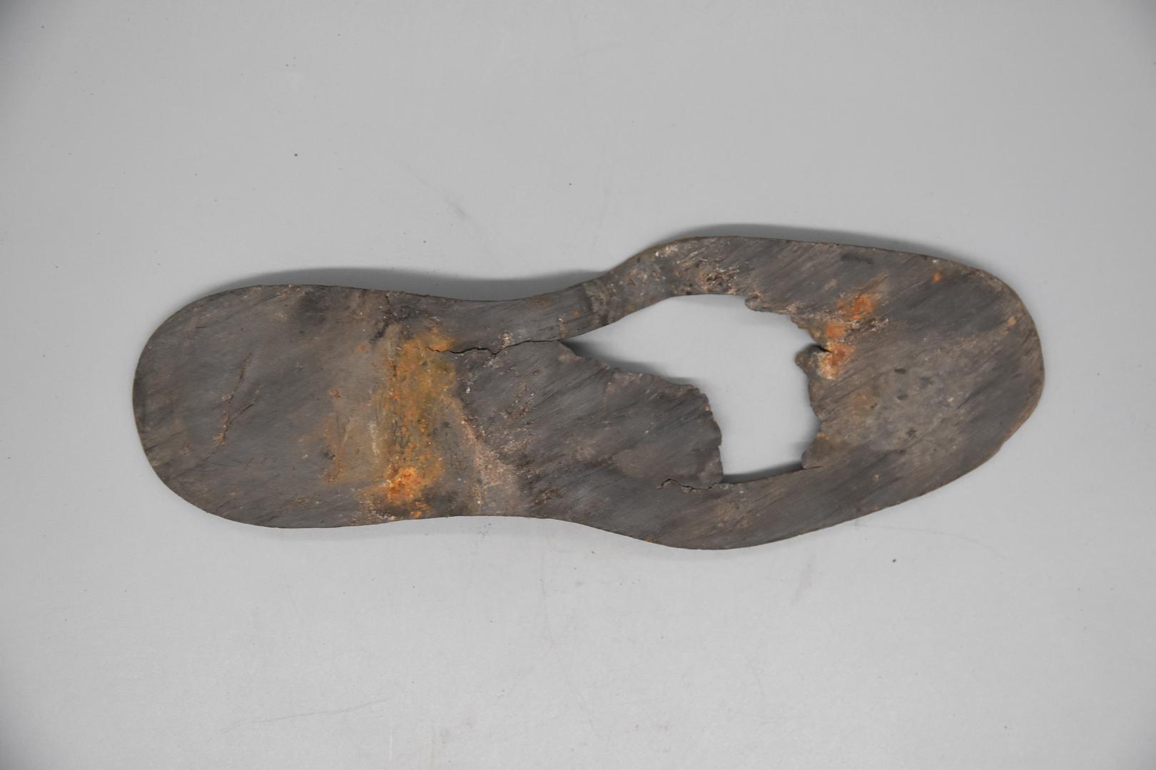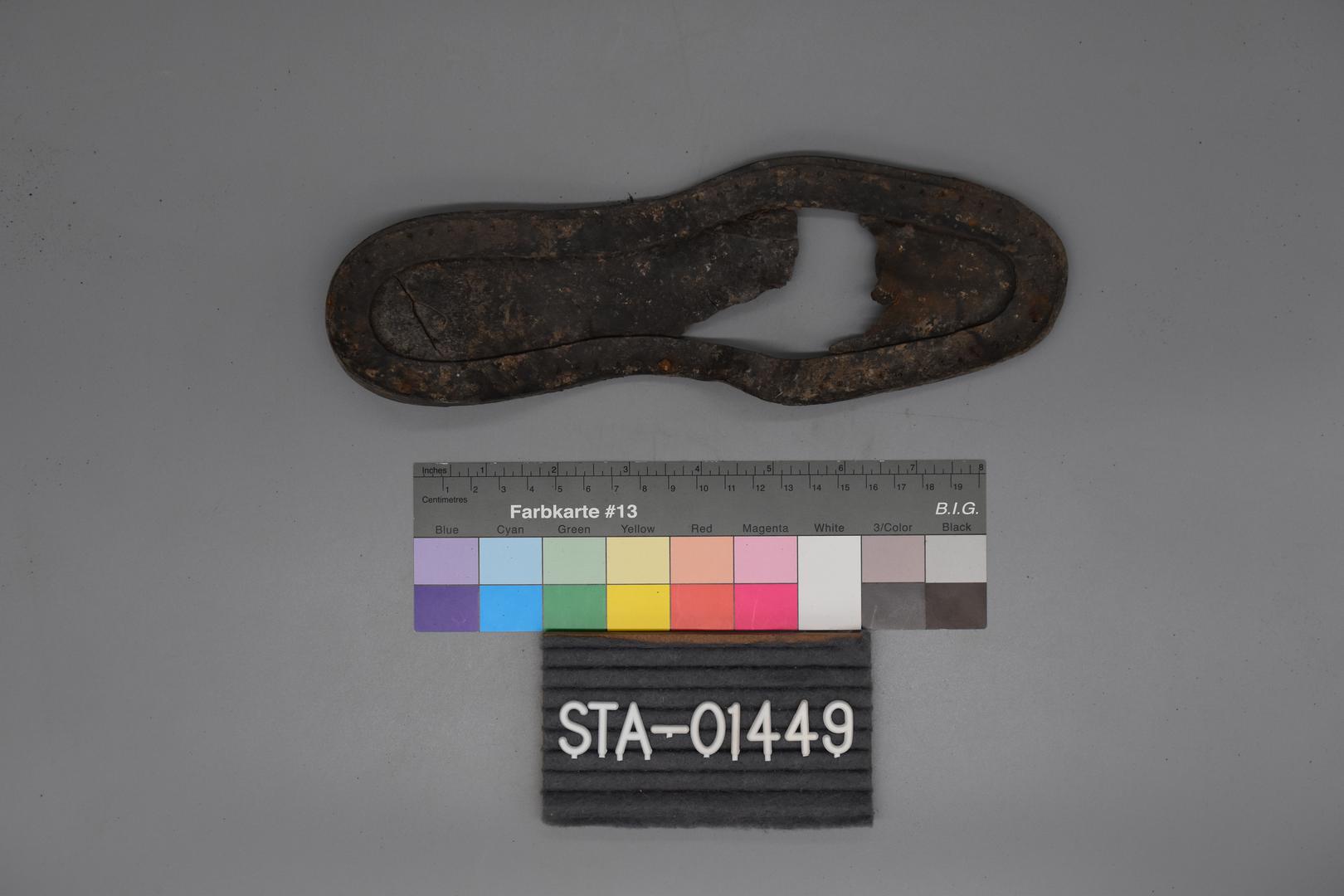 "de": "Eine dunkelgraue Gummisohle. Die Sohle hat in der Mitte eine fehlende Stelle. Die Löcher rund um die Sohle sind deutlich sichtbar und enthalten noch einige Nägel. Die Unterseite ist flach und glatt."