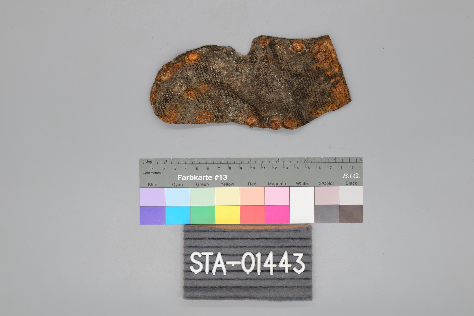 "de": "Eine dunkelbraune Gummischuhsohle. Die Sohle ist strukturiert und sieht aus, als wäre sie gewebt. Sie ist nicht mehr vollständig intakt. Die Nägel sind noch intakt, aber stark korrodiert. Die Sohle ist stark deformiert."