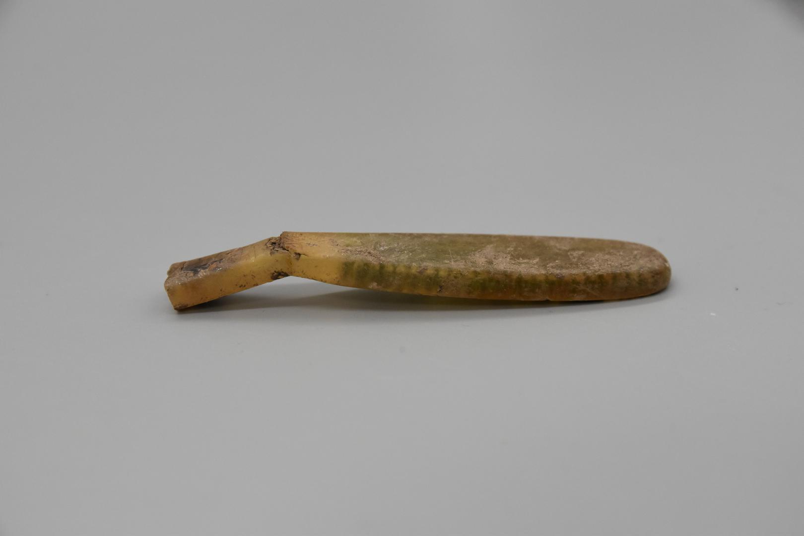"de": "Der leicht transparente, gelbe Zahnbürstenkopf ist länglich rechteckig geformt und die Bürste besteht aus vier Borstenreihen, wobei die Borsten abgerieben sind. Der Bürstenkopf ist zum Griff hin geknickt und die Kanten sind abgerundet."