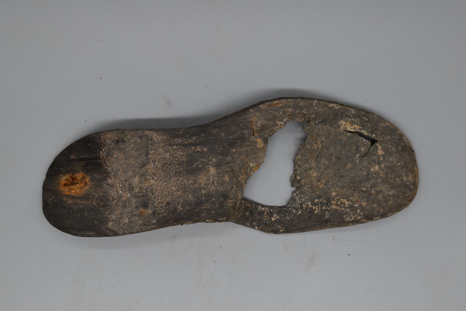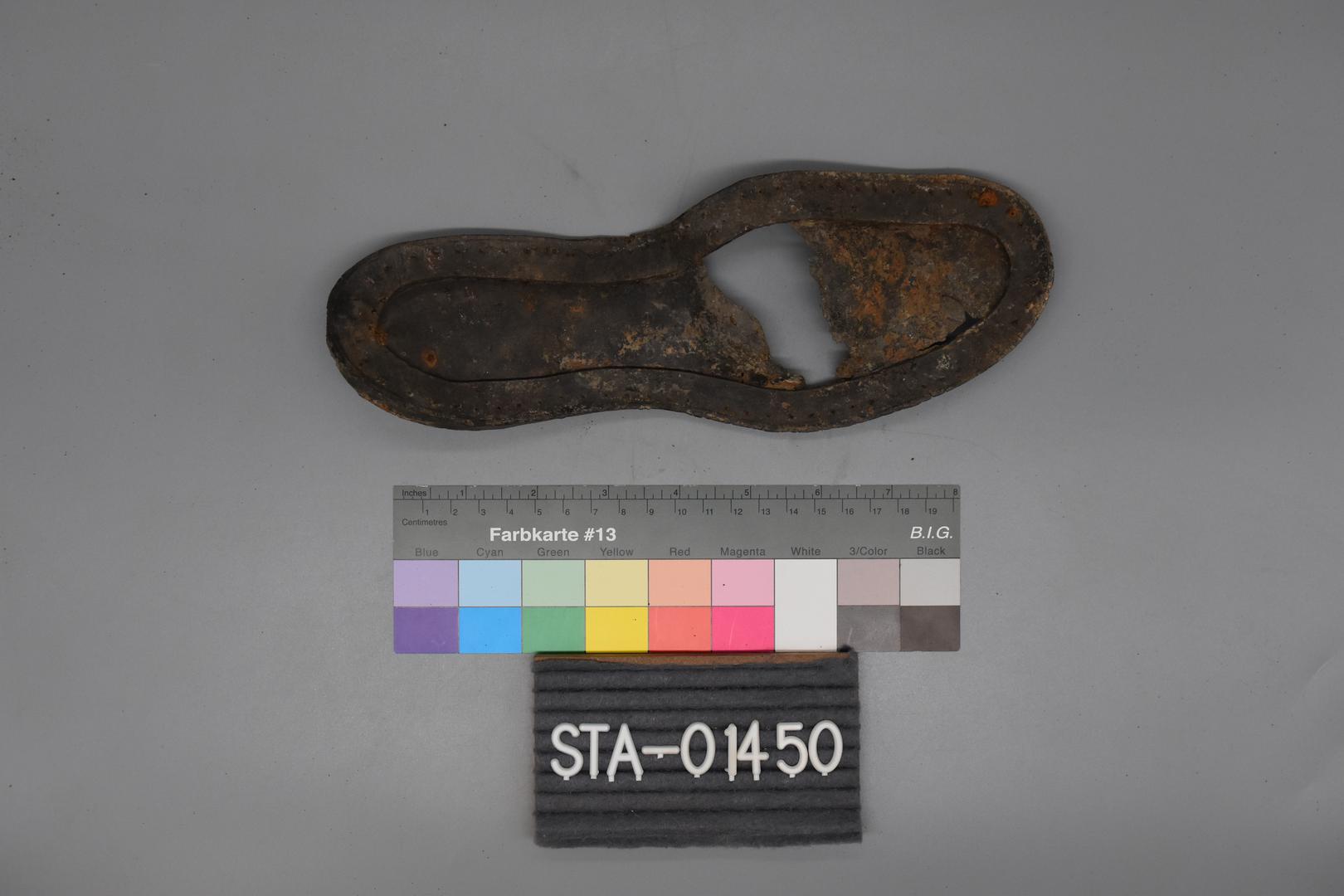 "de": "Eine dunkelgraue Gummisohle. Die Sohle hat in der Mitte eine fehlende Stelle. Die Löcher rund um die Sohle sind deutlich sichtbar und enthalten noch einige Nägel. Die Unterseite ist flach und glatt."