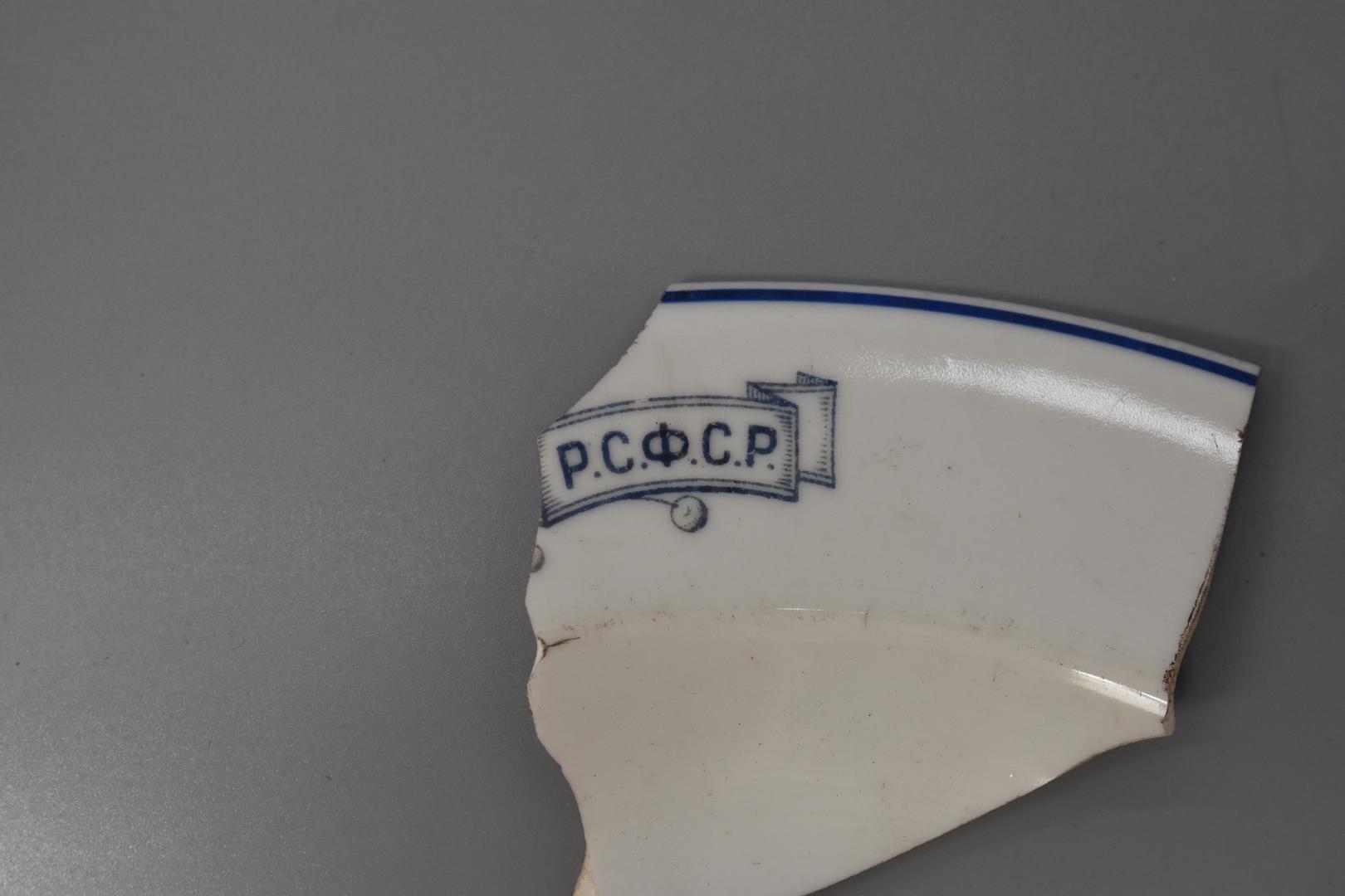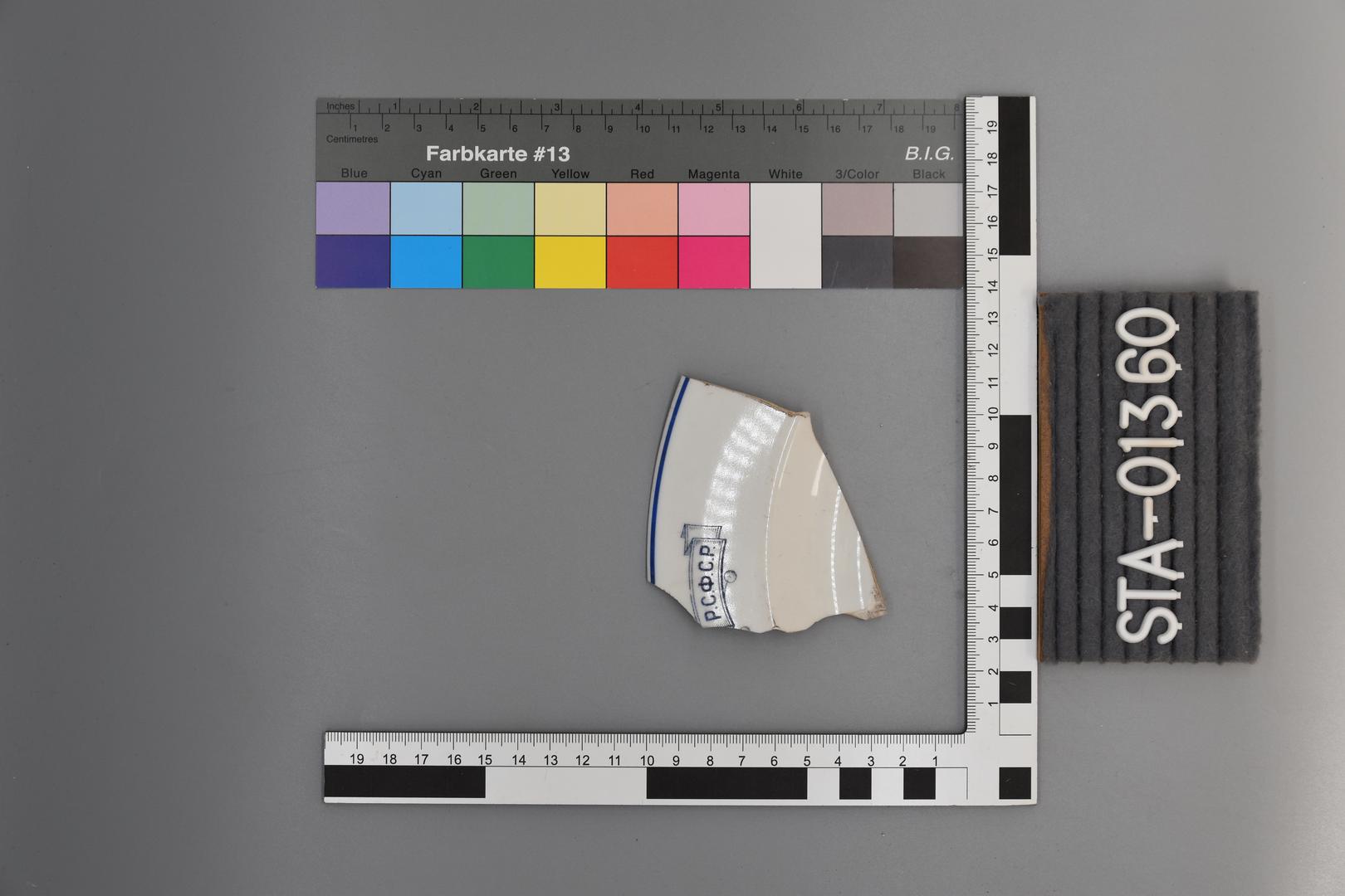 "de": "Das Fragment einer weiß glasierten Porzellan Suppenschale zeigt auf der Oberseite einen Banner in blau mit einer Aufschrift und auf dem Rand ist ein blauer Liniendekor."