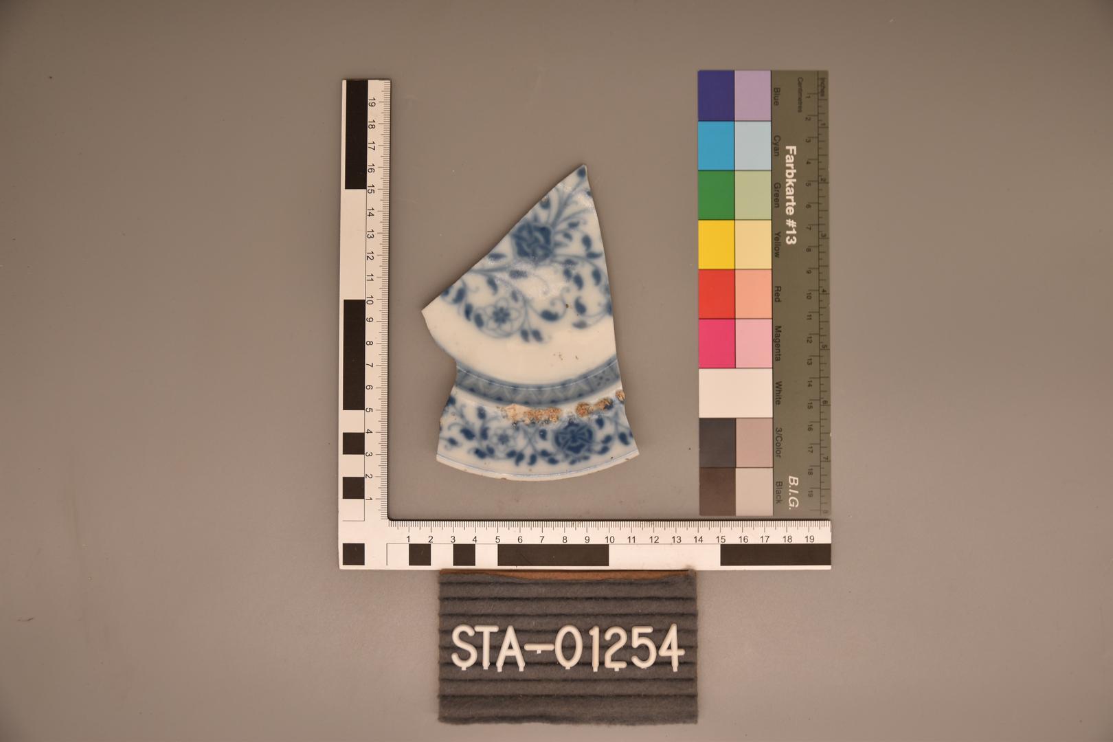 "de": "Der weiße Porzellanteller ist im Bereich der Fahne, der Mulde und dem Spiegel dekoriert. Der Dekor ist floral mit geometrischen Mustern in dunkelblau. Die Fahne ist flach ausladend und die Mulde flach eingetieft. Am Boden befindet sich ein Standring und die Kennzeichnung \"1\"."