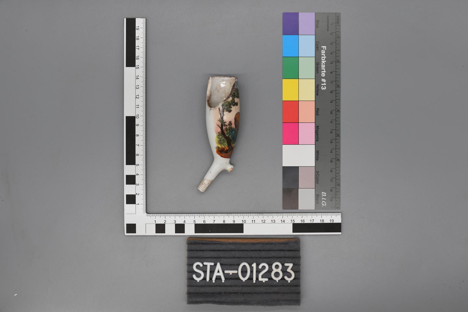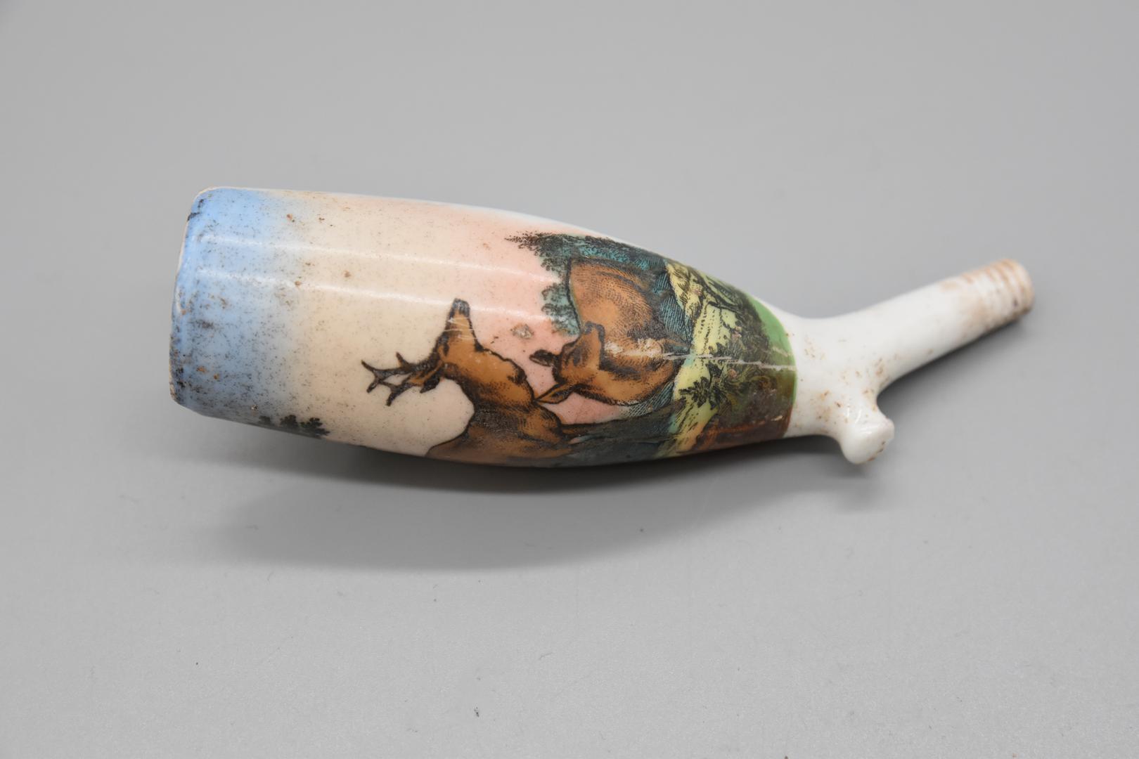 Die Porzellanpfeife ist mit einer Naturszene bemalt. Das Motiv zeigt einen Hirsch und ein Reh auf einer Wiese mit dunkelgrünen Bäumen im Hintergrund und einen Baum im Vordergrund.