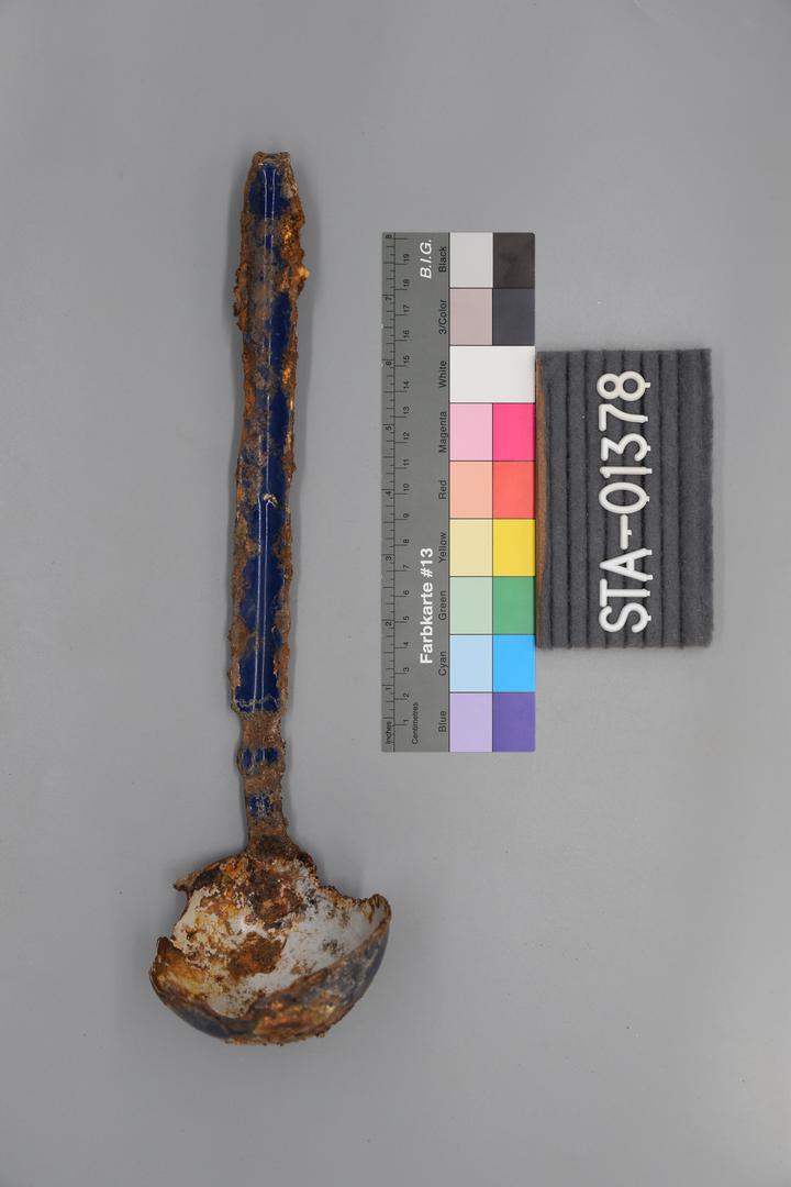 "de": "Der Emailsuppenschöpfer ist weiß und blau und besitzt einen langen Stiel."