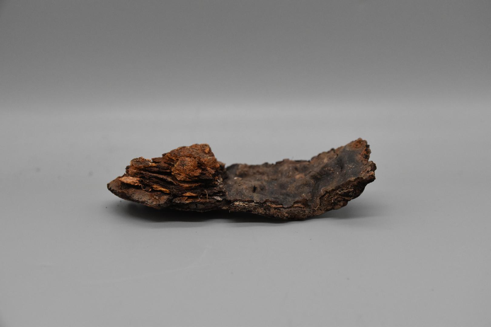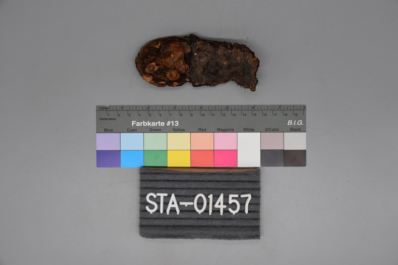 Eine dunkelgraue und -braune Gummisohle eines Kinderschuhs. Die Fersenkonstruktion ist erhalten, ebenso wie die Ferse und der mittlere Teil der Sohle. Der vordere Teil fehlt. Auf der Sohle befinden sich Lederreste und Metallnägel.