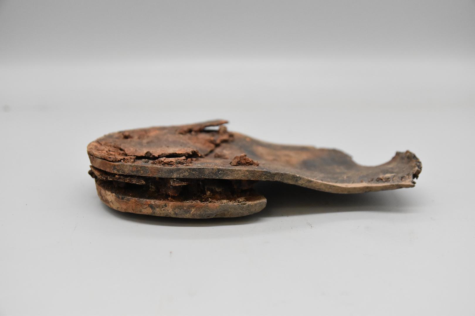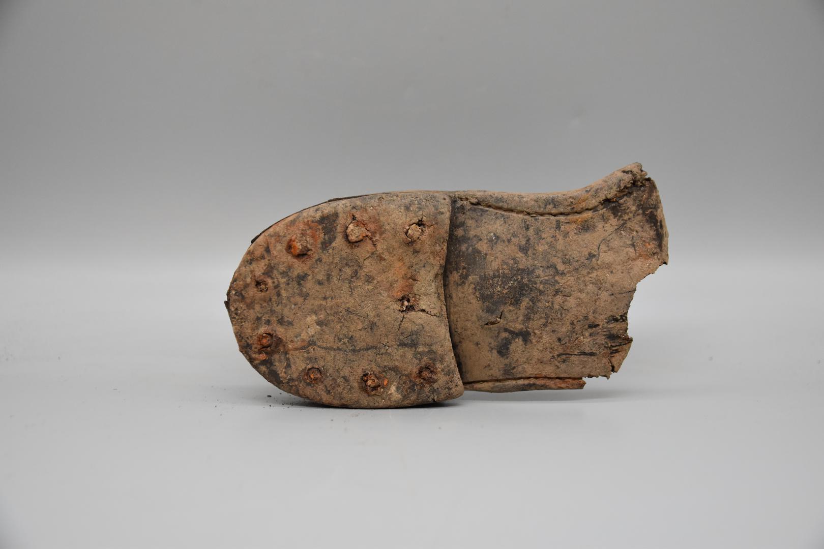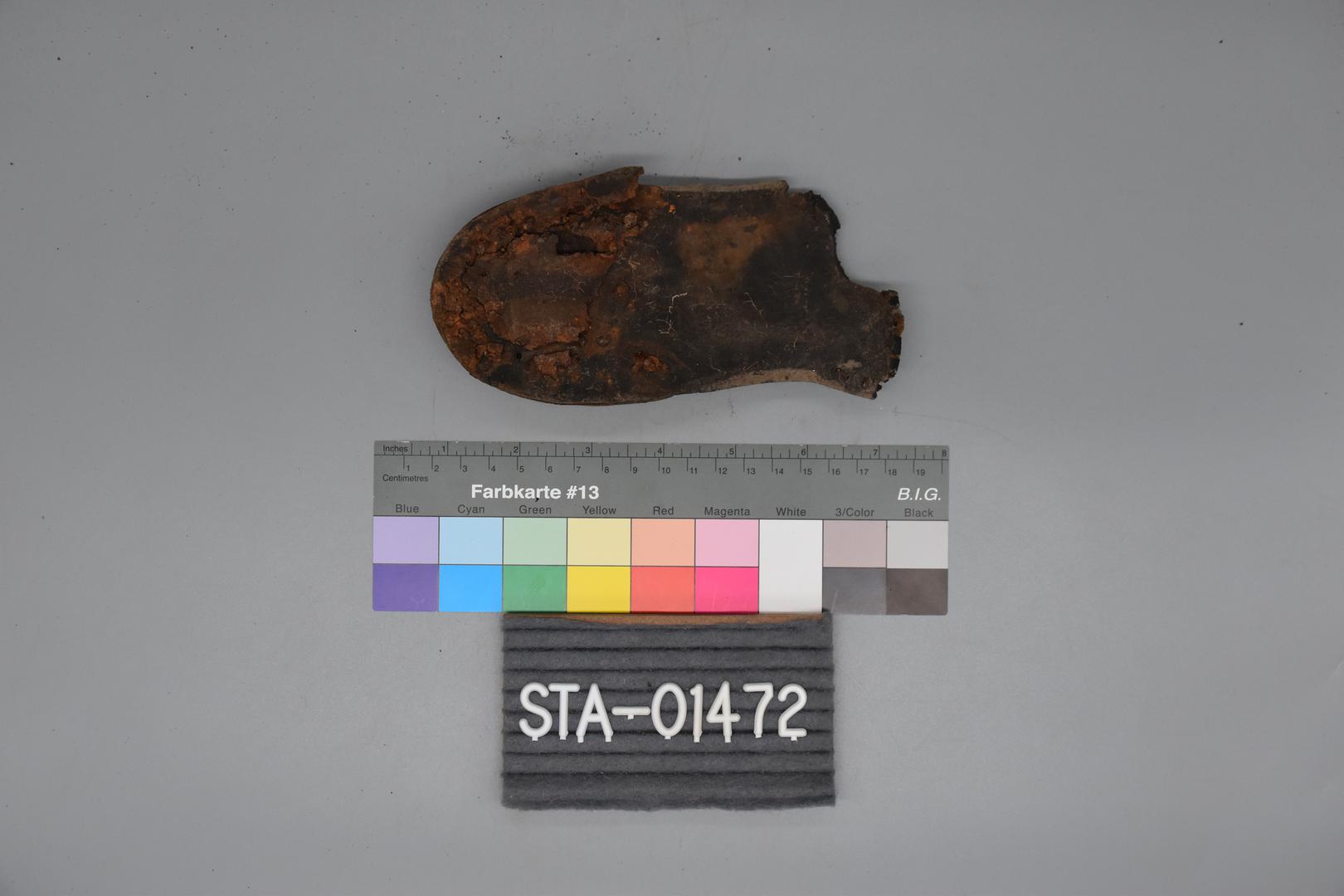 "de": "Die dunkelbraune Schuhsohle ist etwas breiter und nicht sehr groß. Der Absatz ist niedrig. Es befinden sich Löcher und Nägel im Schuh. Der vordere Teil der Sohle fehlt."
