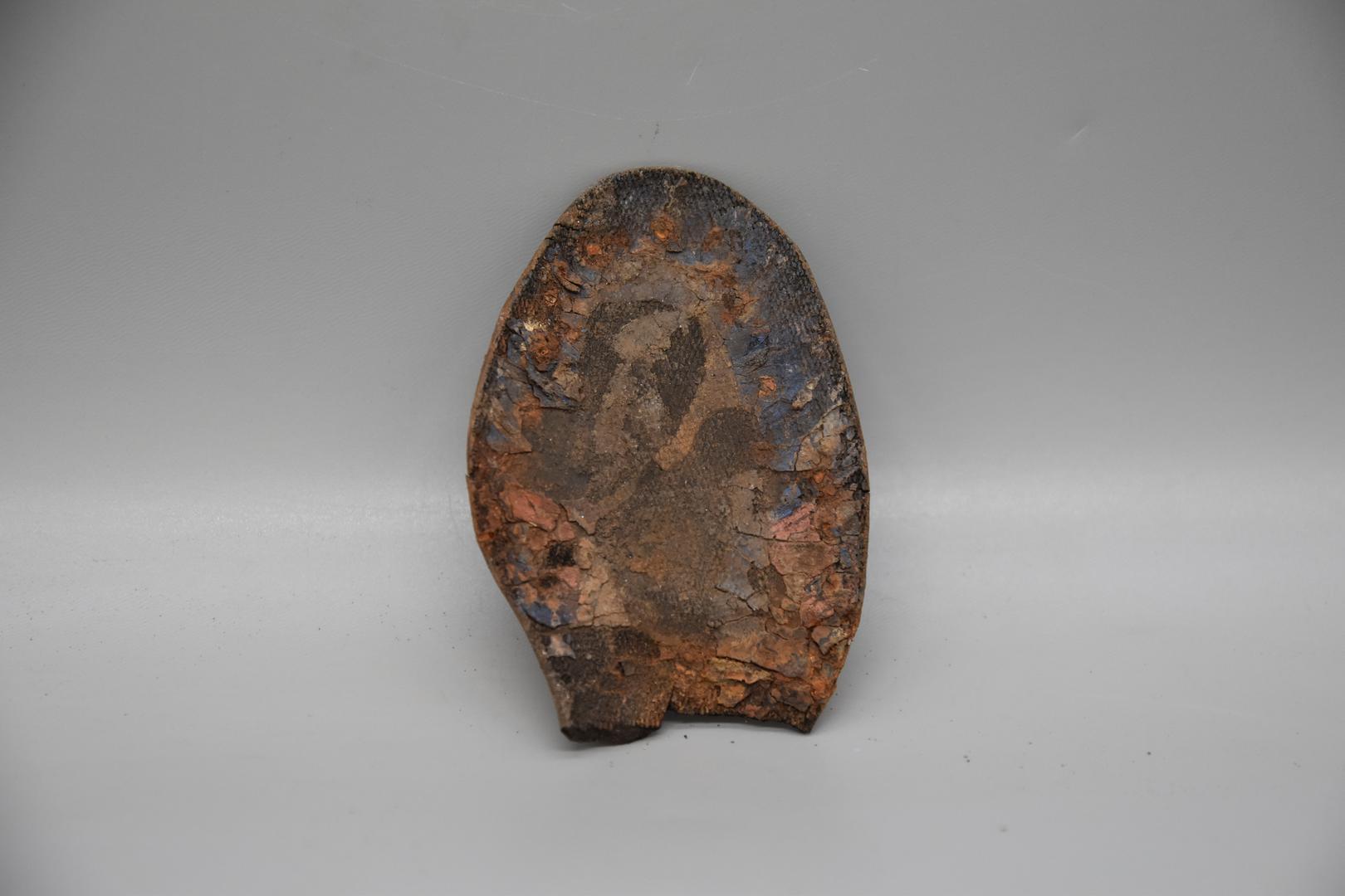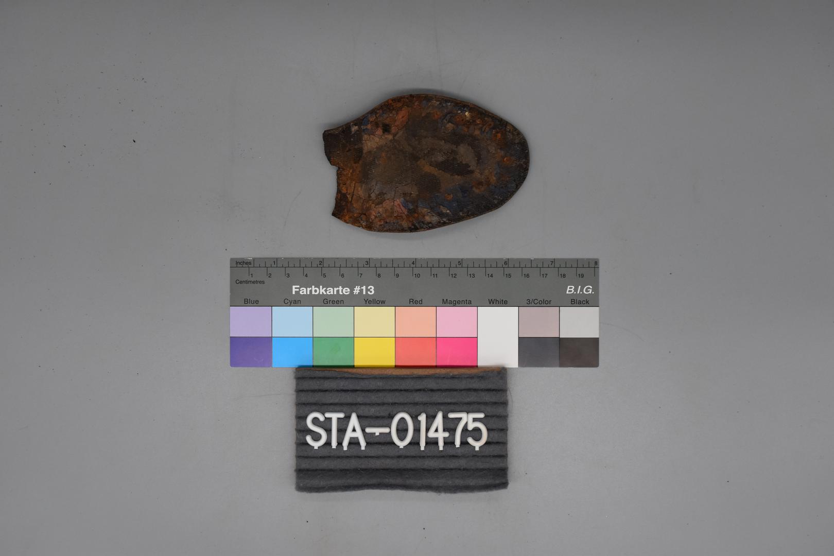"de": "Es ist nur mehr der vordere Teil der dunkelbraunen Schuhsohle erhalten. Die Sohle besitzt eine profilierte Oberseite und die Unterseite ist glatt. Es sind Nägel im Schuh erhalten, sowie rote und blaue Farbreste."