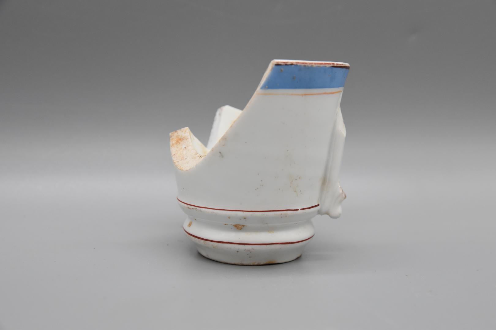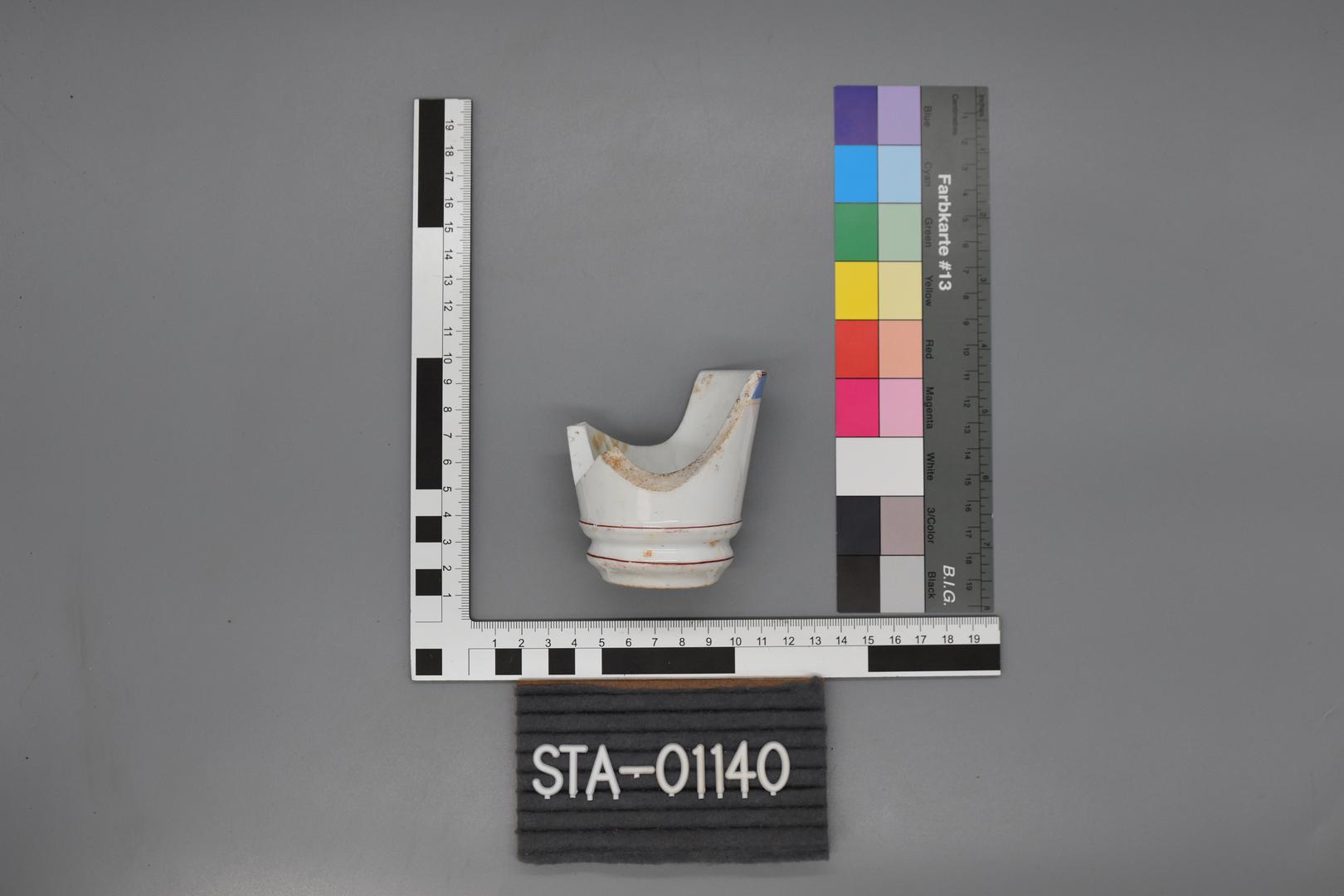 "de": "Das Tassenfragment aus Porzellan ist weiß glasiert und massiv. Ein vertikaler Henkelansatz ist zu sehen. Die Tasse ist profiliert und konisch geformt. Die Tasse ist dekoriert mit einem Linien- und Banddekor in dunkelroter, oranger und blauer Farbe."
