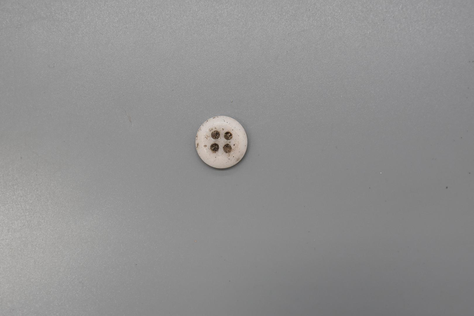 Ein weißer runder Knopf mit vier Löchern. Vom Rand zur Mitte ist er auf der Vorderseite vertieft. Der Rand ist nach hinten abgerundet.