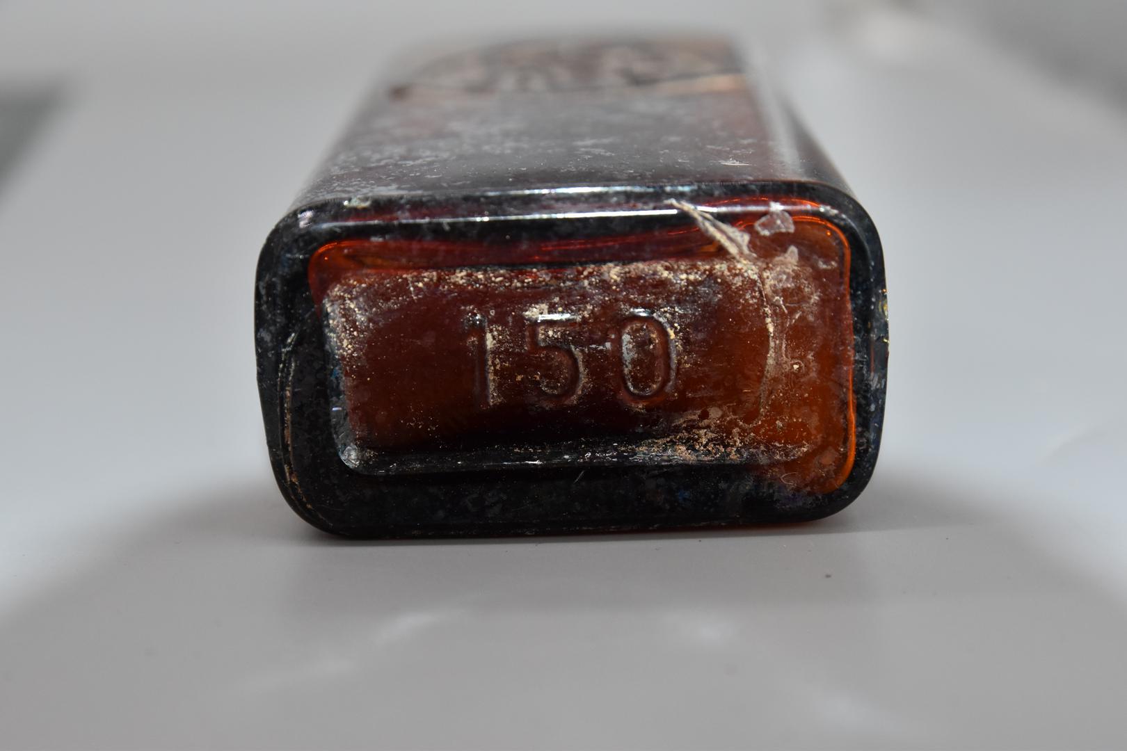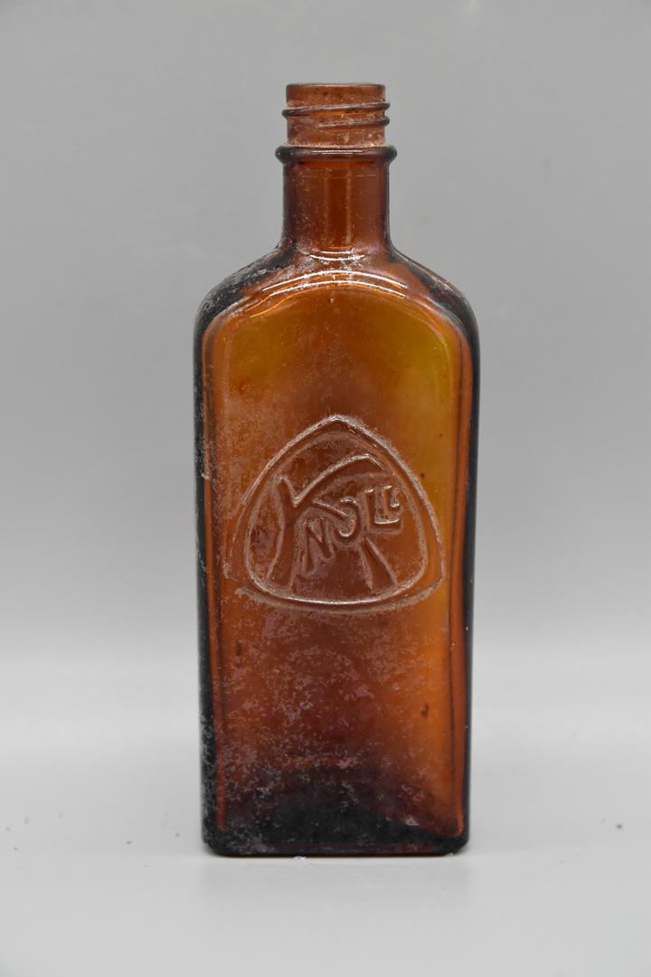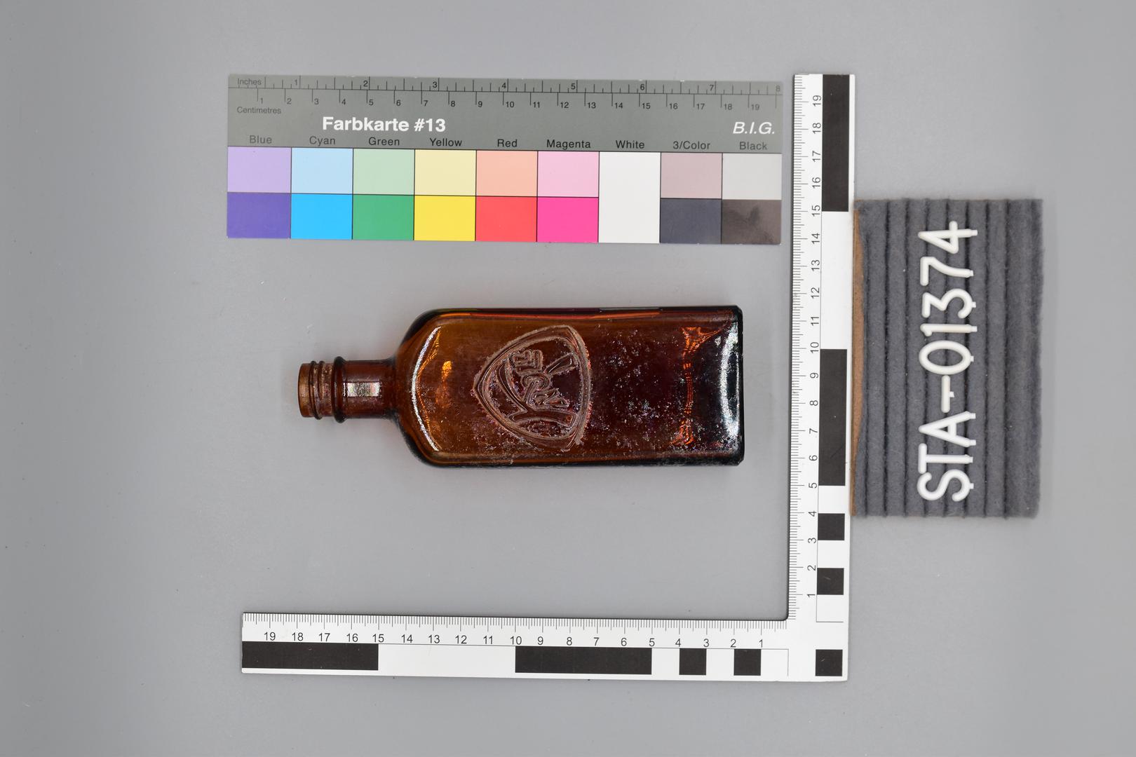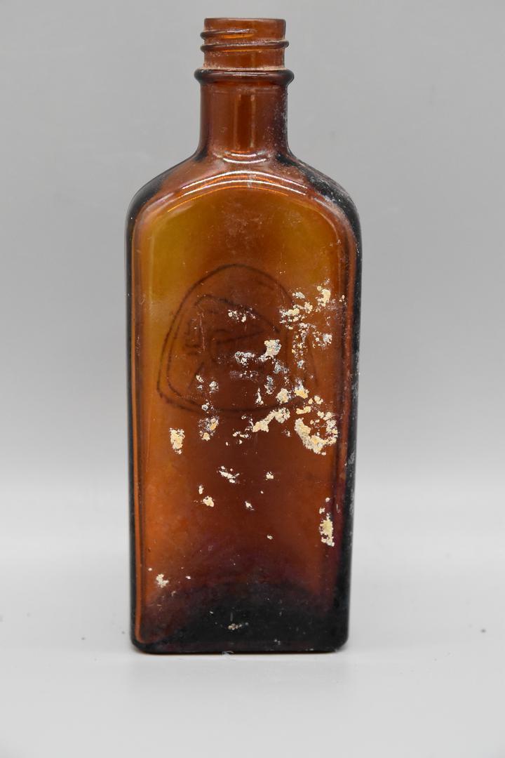 Die braune Glasflasche besitzt eine rechteckige Grundform. Der Hals ist gerade geformt und hat Drehrillen die in einem Absatz enden. Die Schultern sind abfallend und der Körper ist gerade. Der Boden ist leicht nach innen gewölbt.