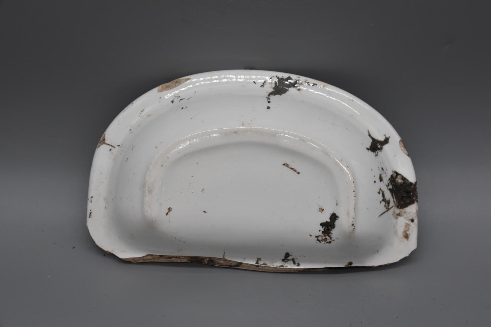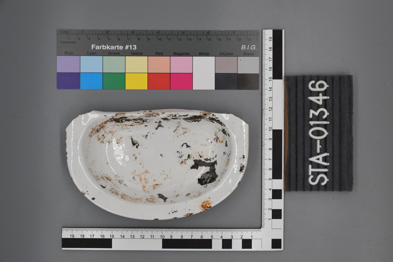 "de": "Die nierenförmige Steingutschale ist weiß glasiert. Der Rand ist horizontal nach außen gezogen und verdickt. Der Standring ist c-förmig. Sie ist nicht mehr vollständig erhalten."