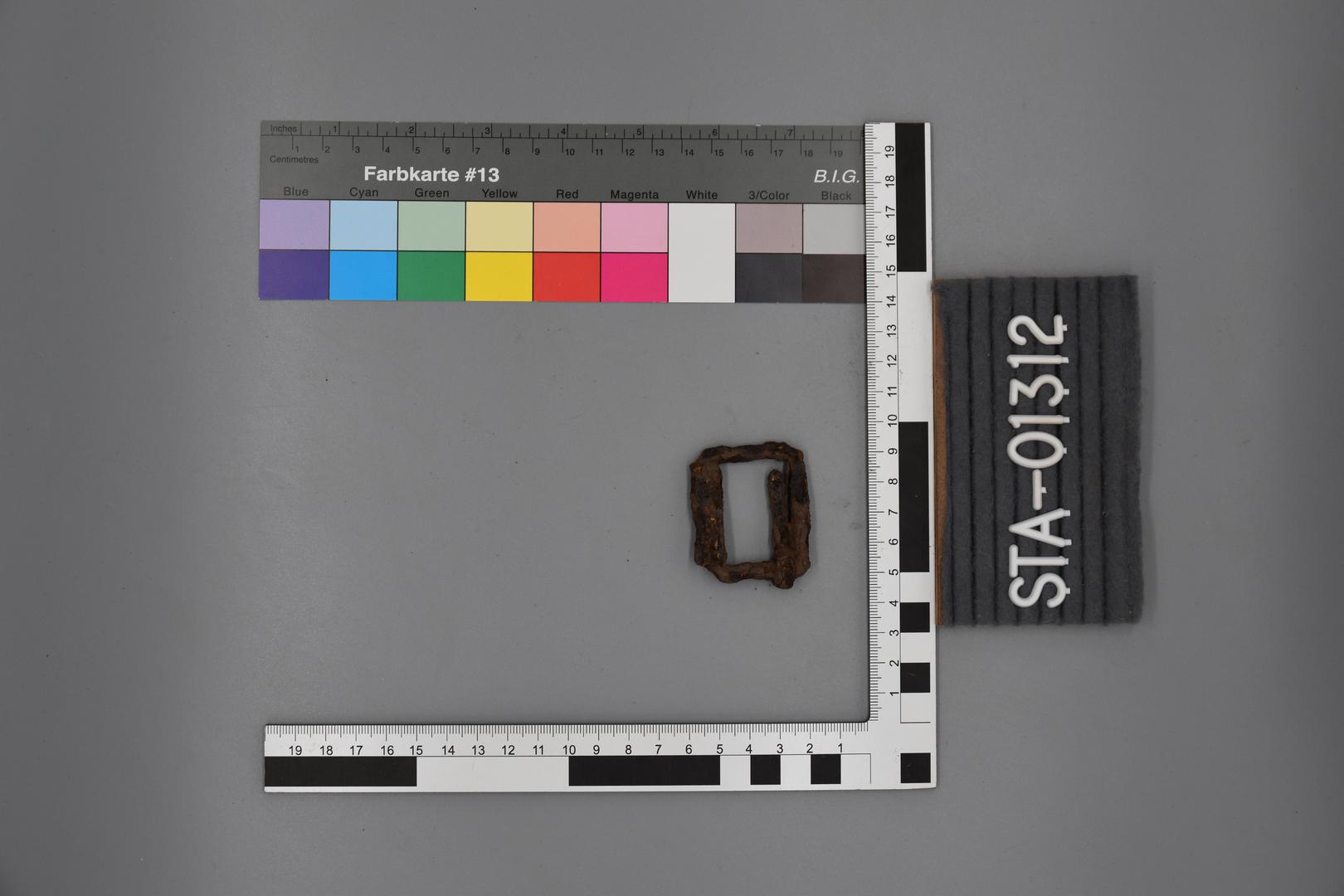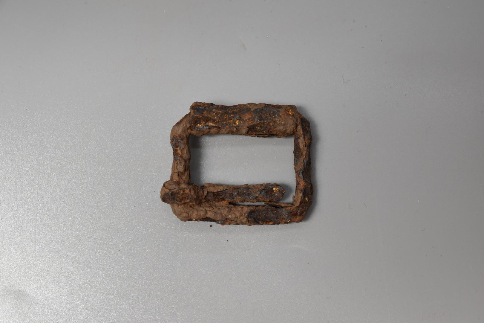 Die Gürtelschnalle ist rechteckig geformt und hat auf einer Seite eine Verdickung die wie eine Ummantelung aussieht. Die Befestigungsnadel ist noch erhalten.