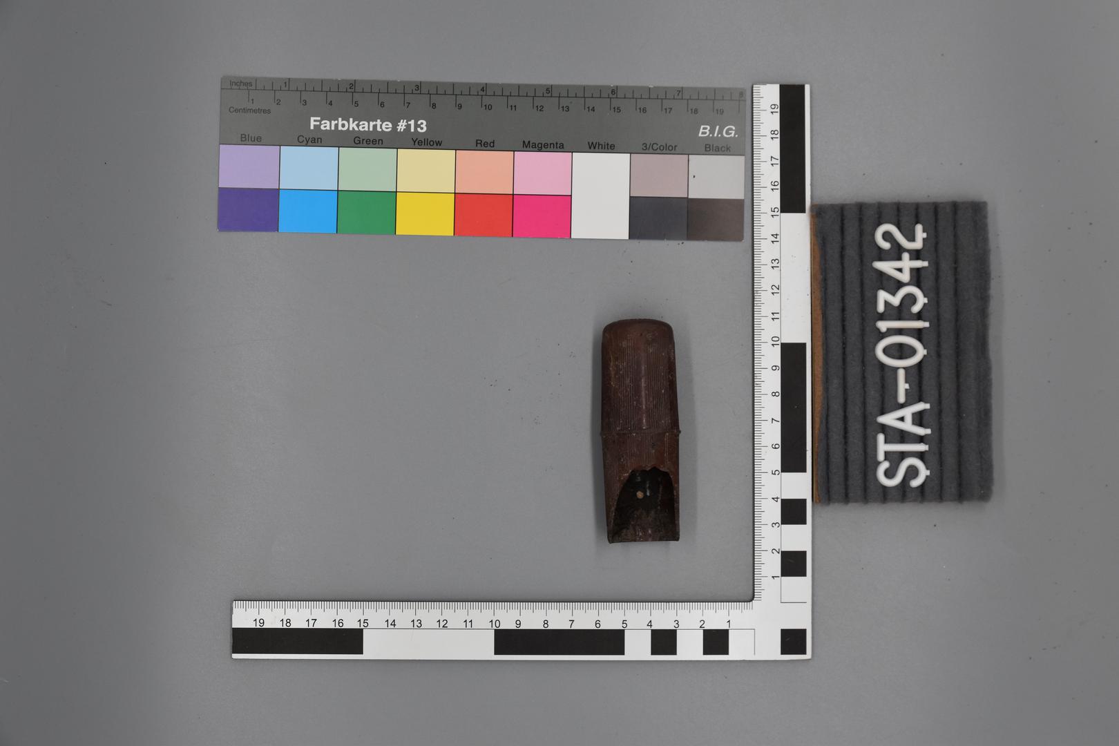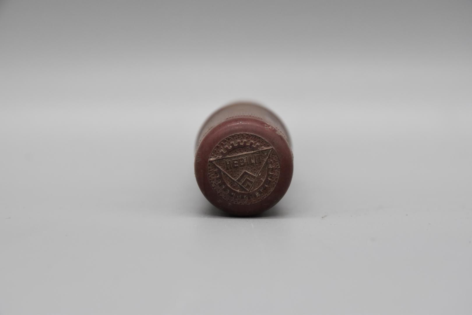 Ein brauner Griff, zylindrisch geformt, mit Rillen die in der Mitte von einer Wulst unterbrochen sind. Am Griffende ist ein Zahnradmotif eingedrückt und darinnen befindet sich ein Dreieck das im Inneren mit "HEBILIT" beschriftet ist.