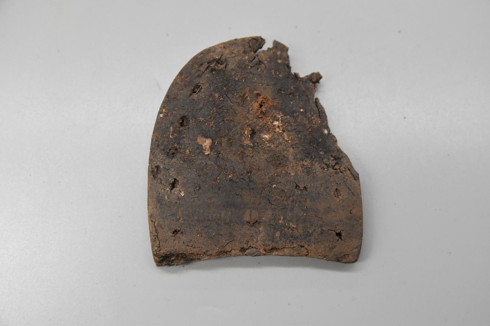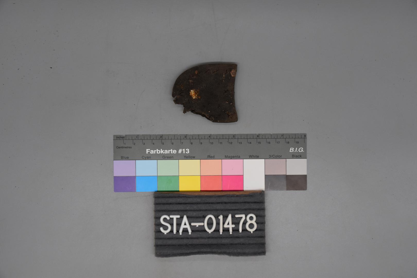 "de": "Ein schwarzer hufeisenförmiger Absatz eines Schuhes mit einer profilierten Seite. Der Schuh enthält Nägel und Löcher. In der Mitte ist eine Raute eingeprägt. An der runden Seite sieht man Fehlstellen."