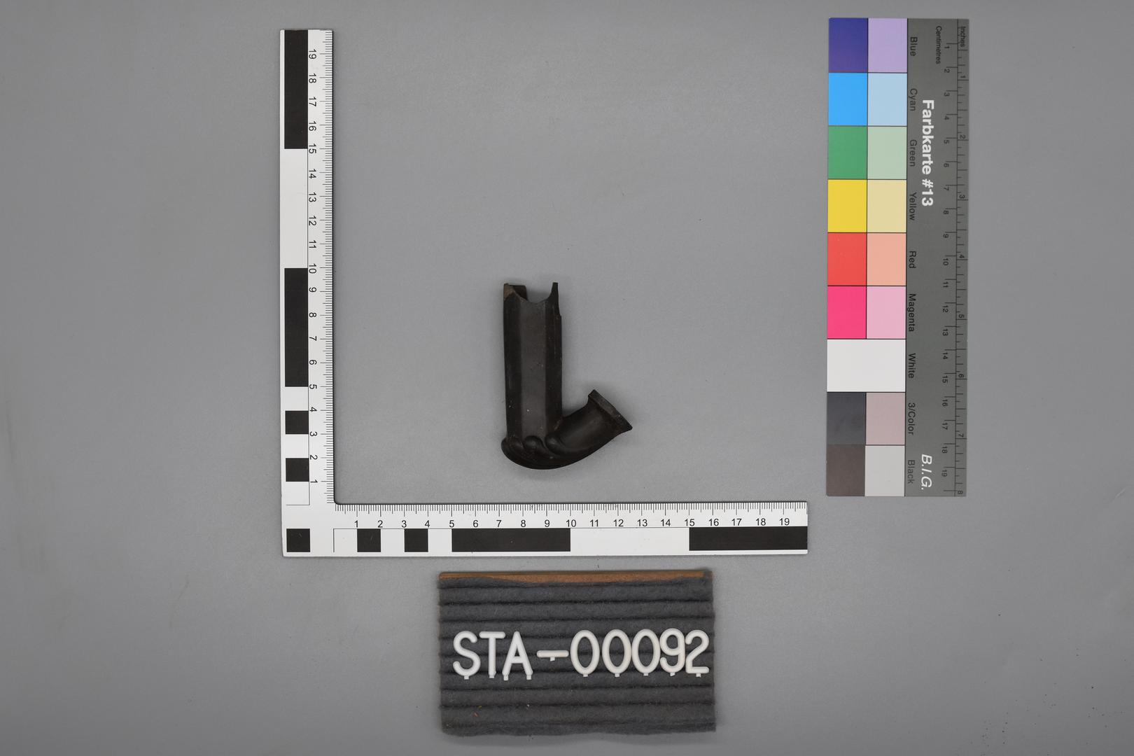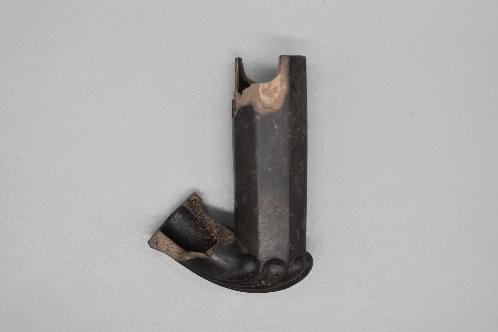 Das Objekt ist eine schwarze Kaffeehauspfeife. Sie hat einen oktogonalen Schaft und ein rundes Mundstück mit verdicktem Rand. An der Unterseite befindet sich ein großes Rankenornament.