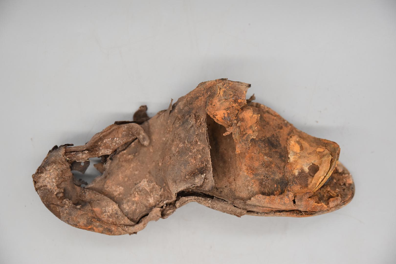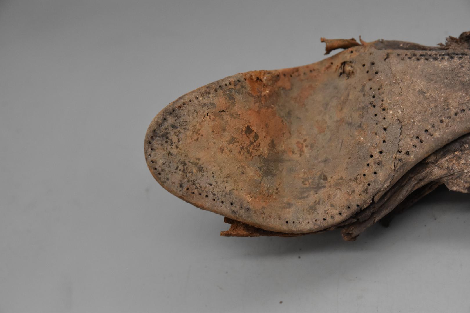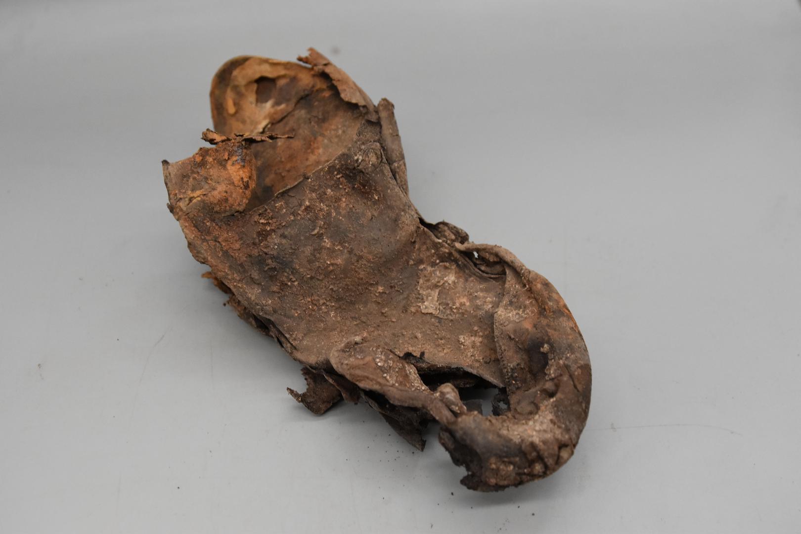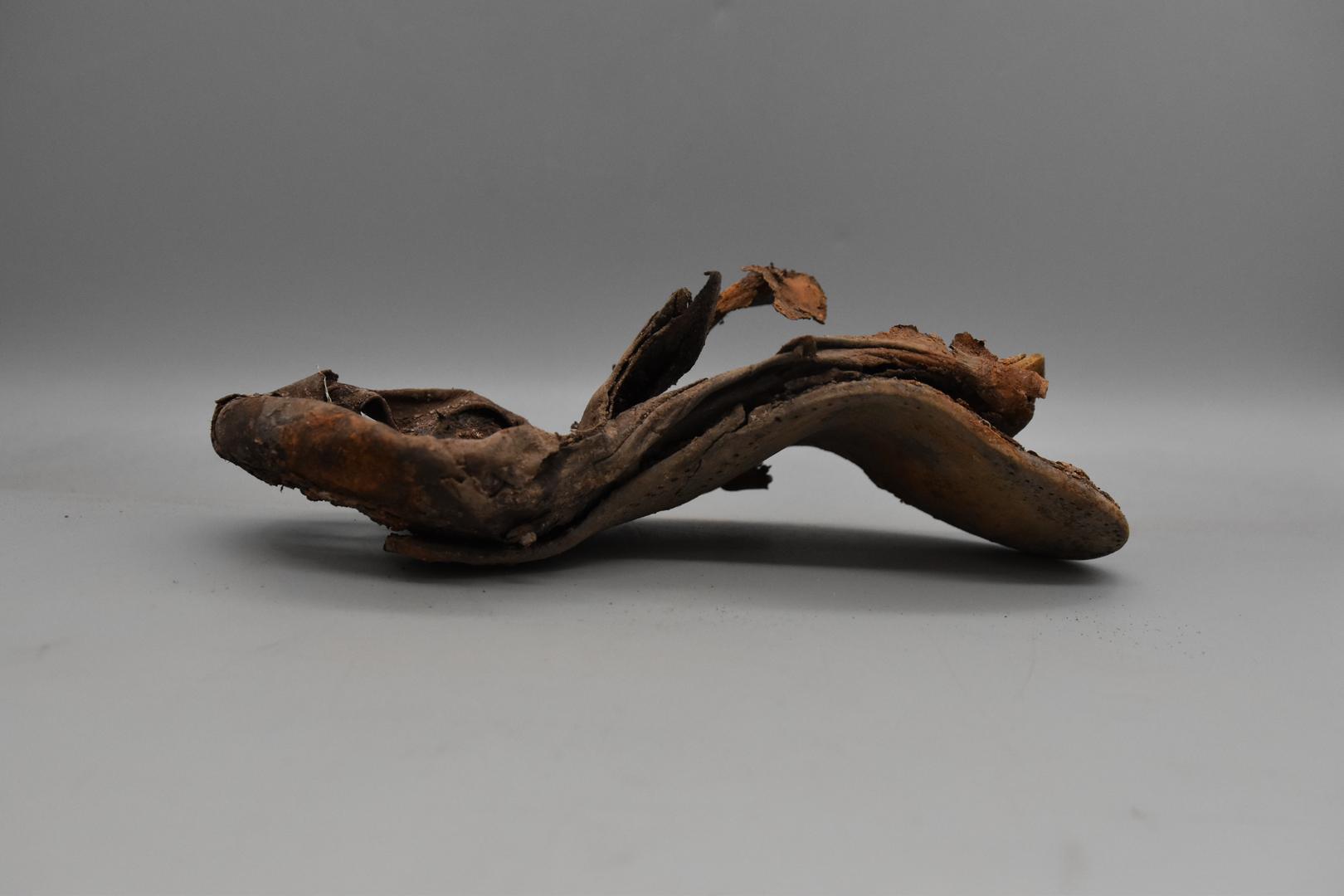 Der dunkelbraune Schuh ist nicht vollständig erhalten, sondern nur der untere Teil. Er ist stark verformt und aufgebogen. Die Ferse ist teilweise erhalten. Am Schuh sind Löcher und auch Nägel zu sehen.
