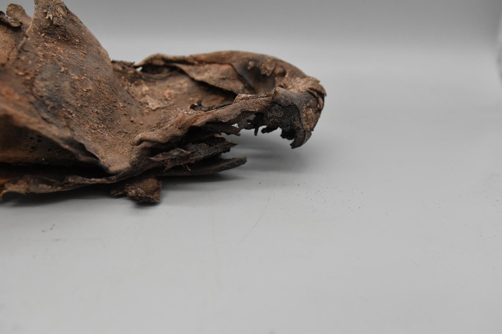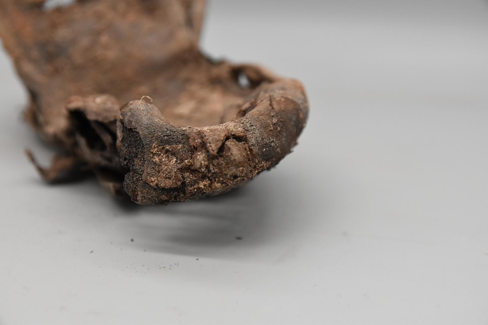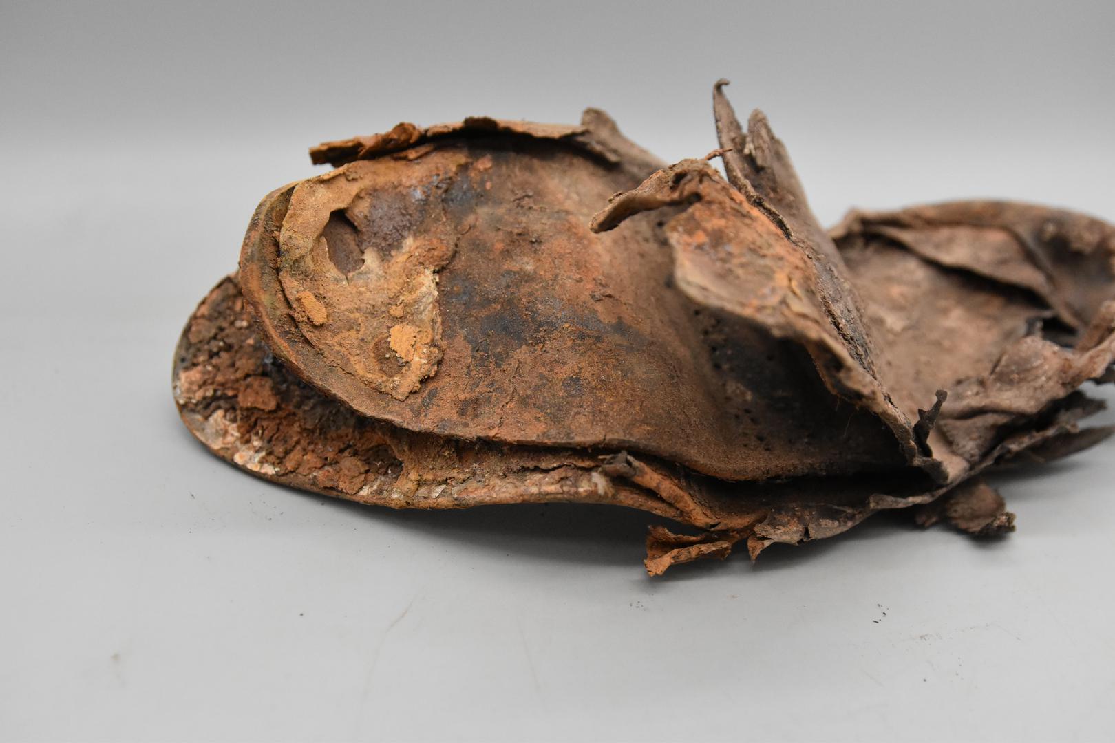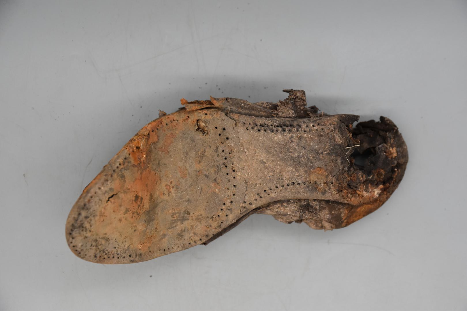 Der dunkelbraune Schuh ist nicht vollständig erhalten, sondern nur der untere Teil. Er ist stark verformt und aufgebogen. Die Ferse ist teilweise erhalten. Am Schuh sind Löcher und auch Nägel zu sehen.
