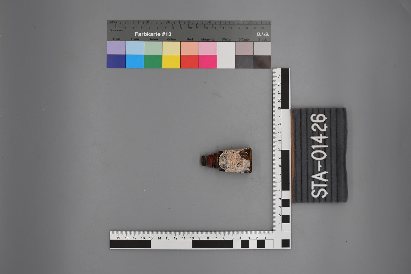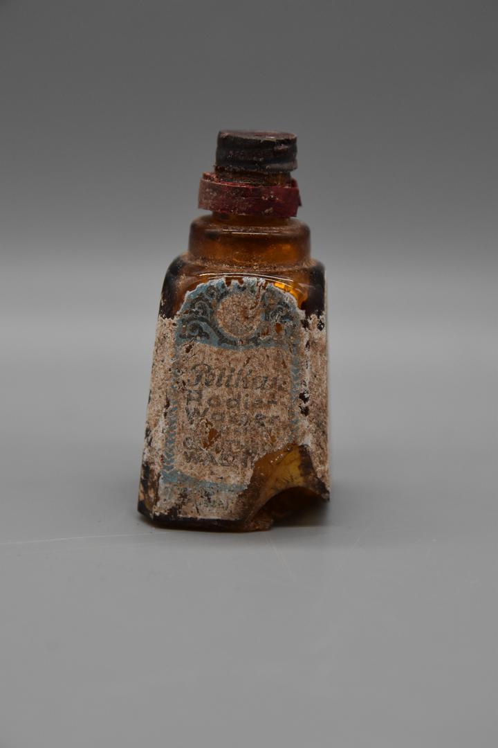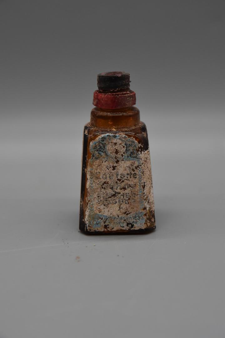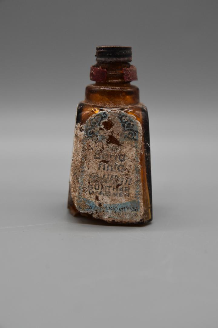 Ein kleines, braunes Glasfläschchen das einen pyramidenförmigen Körper hat. Der Hals ist abgesetzt und rund. Ein Rest einer roten Verschlusskappe ist noch erhalten. Im Inneren befindet sich ein Applikator, der herausnehmbar ist.