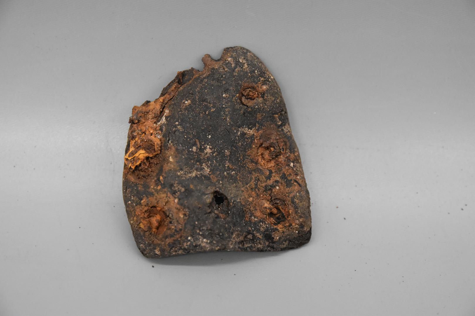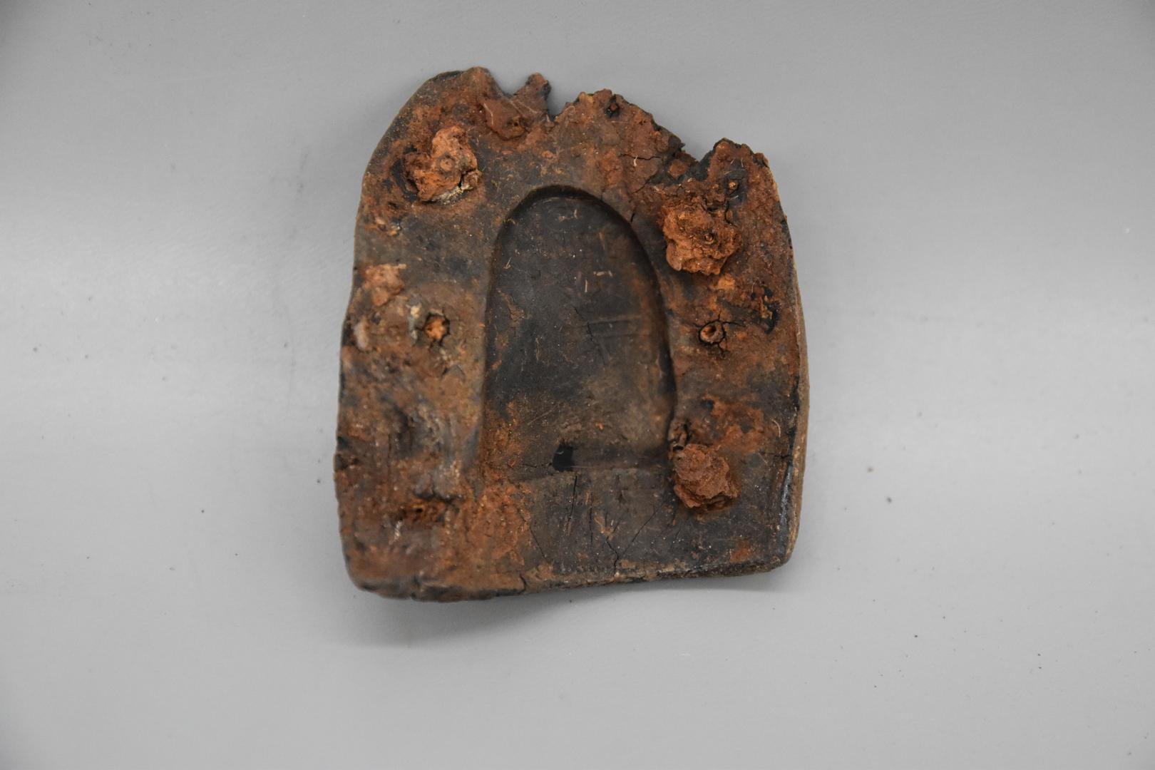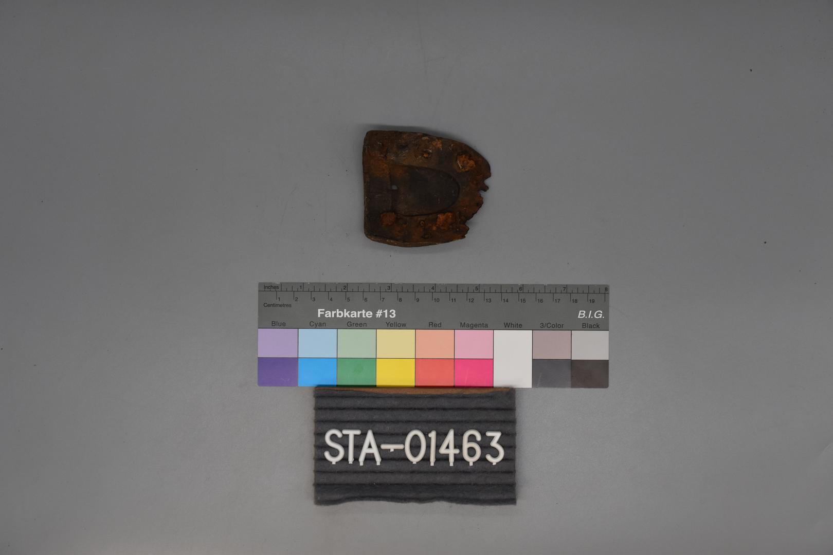"de": "Der dunkelgraue Schuhabsatz ist hufeisenförmig und hat an der geraden Seite einen gezackten Bruch. Im Absatz befinden sich Löcher, in denen noch Nägel stecken. Auf einer Seite ist der Markenname eingeprägt."