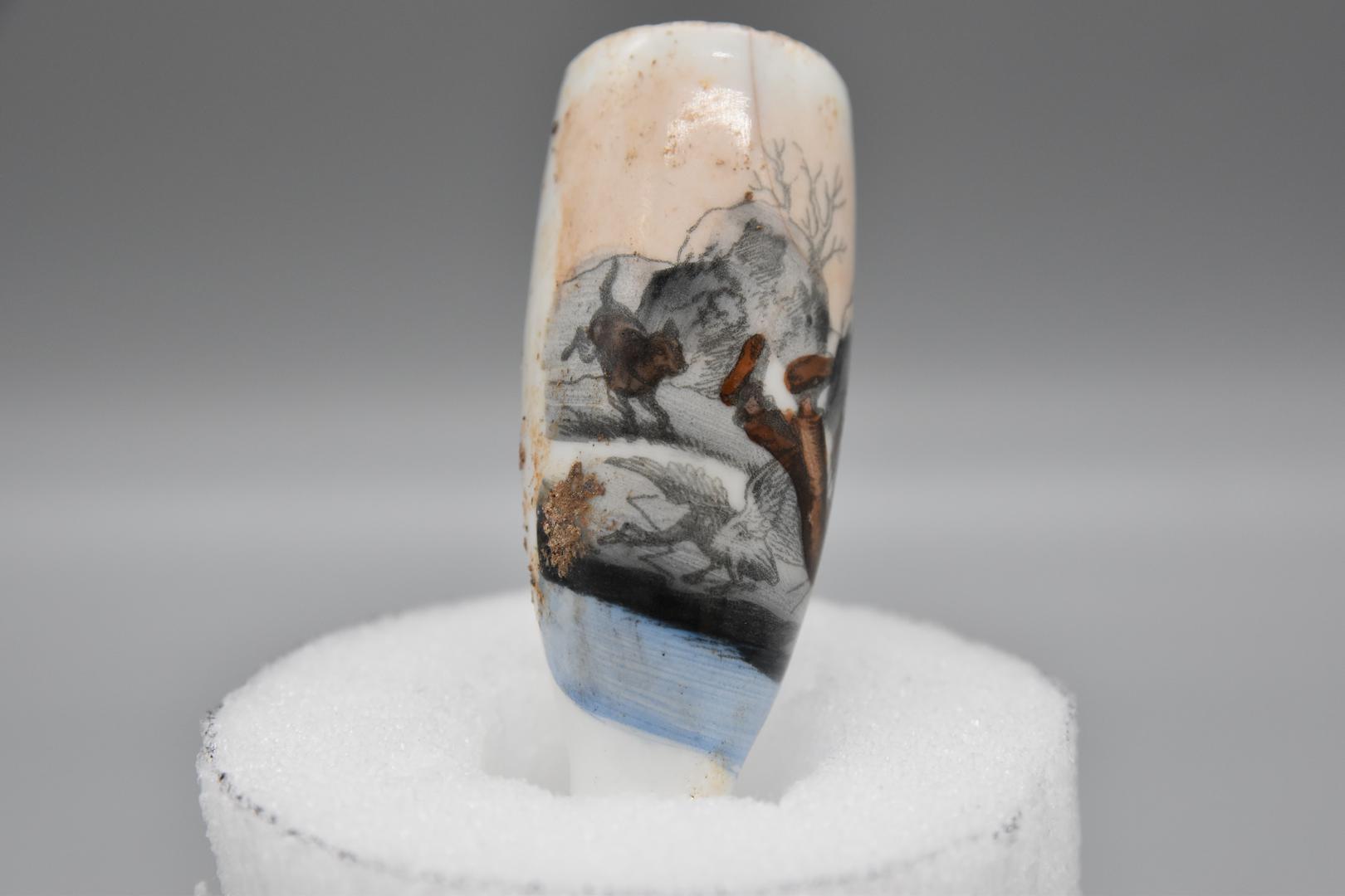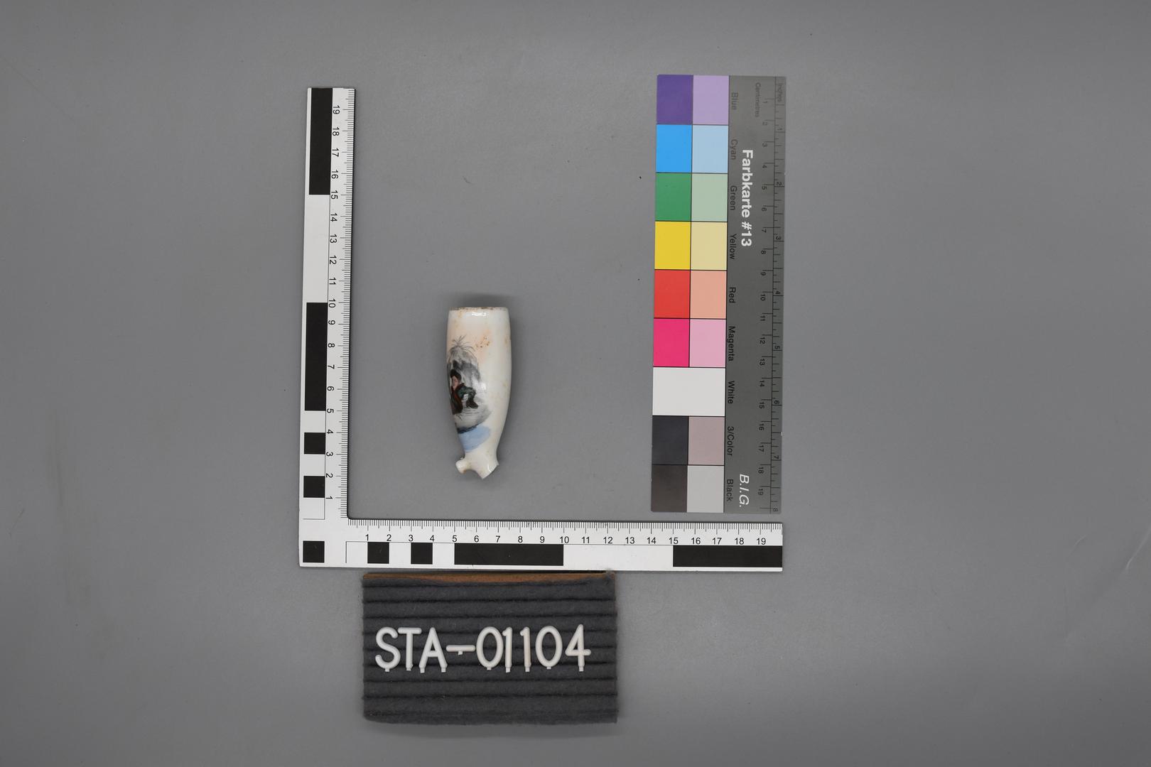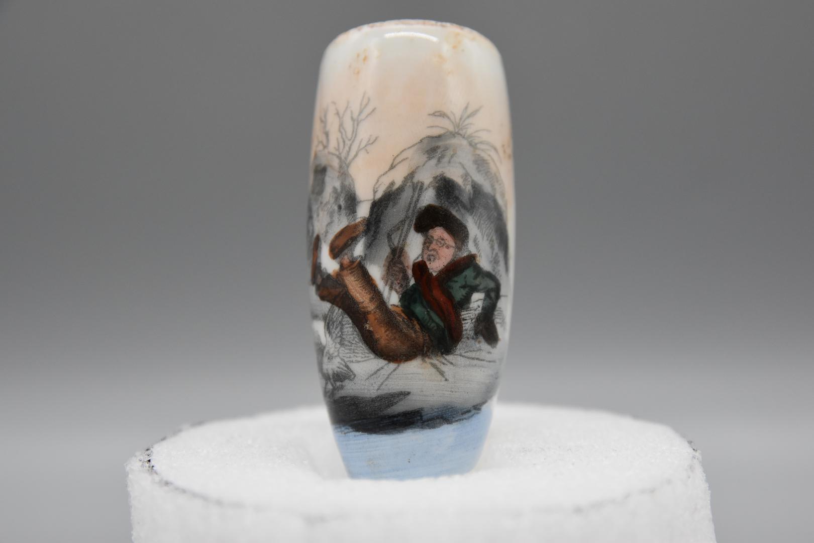 Die Porzellanpfeife ist weiß glasiert und bemalt. Zu sehen ist eine misslungene Entenjagd. Der Jäger ist zu Boden gefallen, links im Bild läuft ein Hund in die Richtung des Jägers und links unten sieht man eine Ente mit angehobenen Flügeln.
