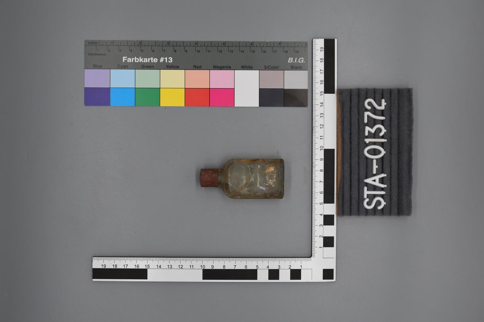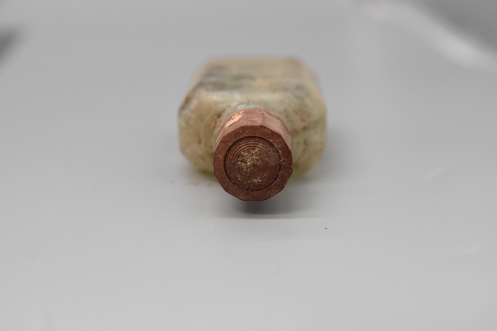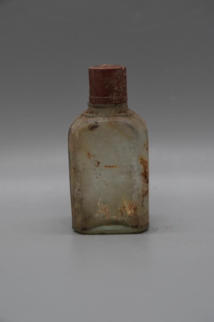 Die kleine Flasche besitzt keinen Inhalt und sie ist rechteckig mit achteckiger Grundform. Die Schulter ist leicht gewölbt abfallen. Der Körper ist gerade. Sie hat eine braune Drehverschlusskappe, die eckig geformt ist und oben in der Mitte mehrere Kreise hat.