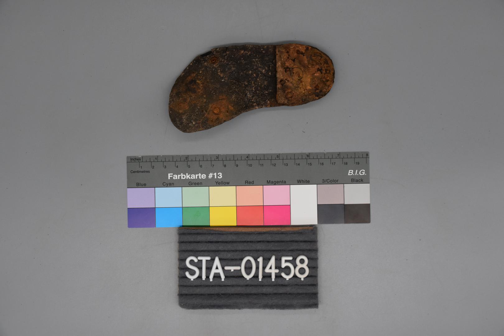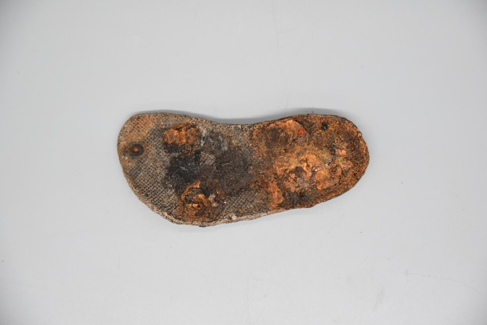 Eine dunkelgraue und -braune Gummisohle eines Kinderschuhs. Die Oberseite ist stark profiliert. Die Ferse ist intakt, aber nicht mehr mit der Sohle verbunden. Im vorderen Bereich befinden sich drei Löcher, die wahrscheinlich dazu dienten, Riemen zu befestigen, damit der Schuh als Sandale getragen werden konnte.