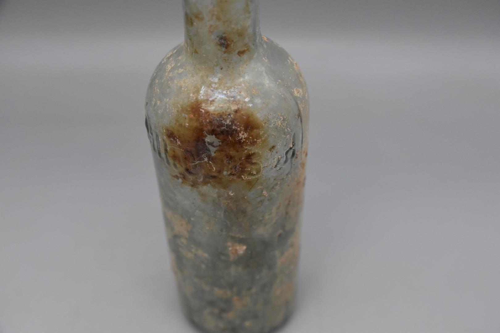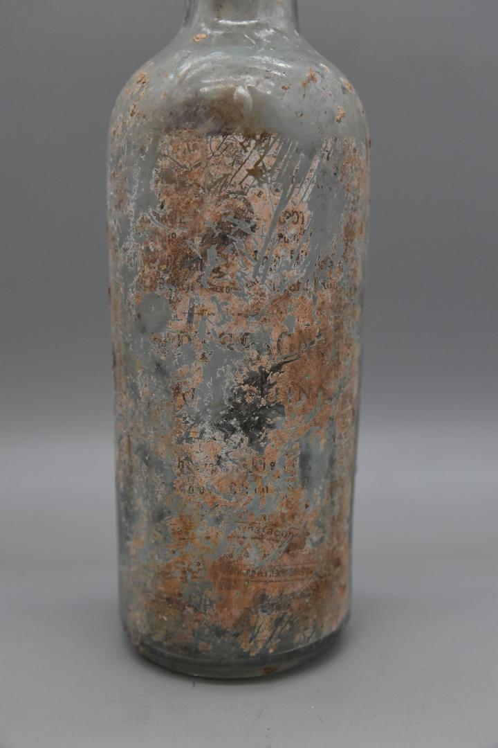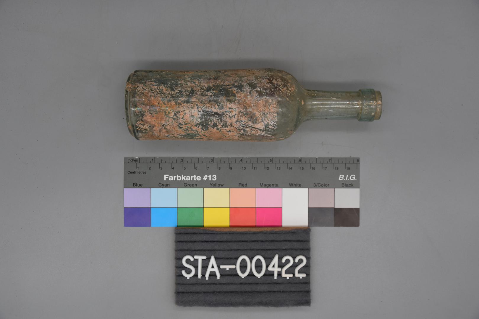 Die Glasflasche ist zylindrisch und die Flaschenöffnung ist schmal. Die Schulter ist ausladend und der Boden ist leicht nach innen gezogen. Auf der Flasche befinden sich noch Etikettreste.