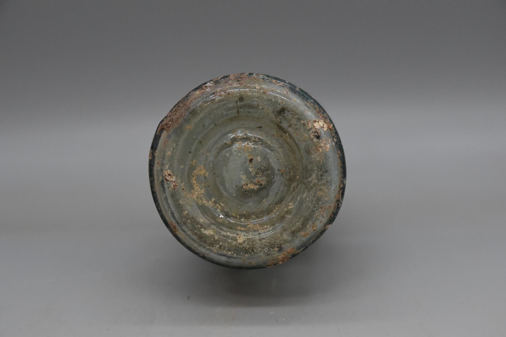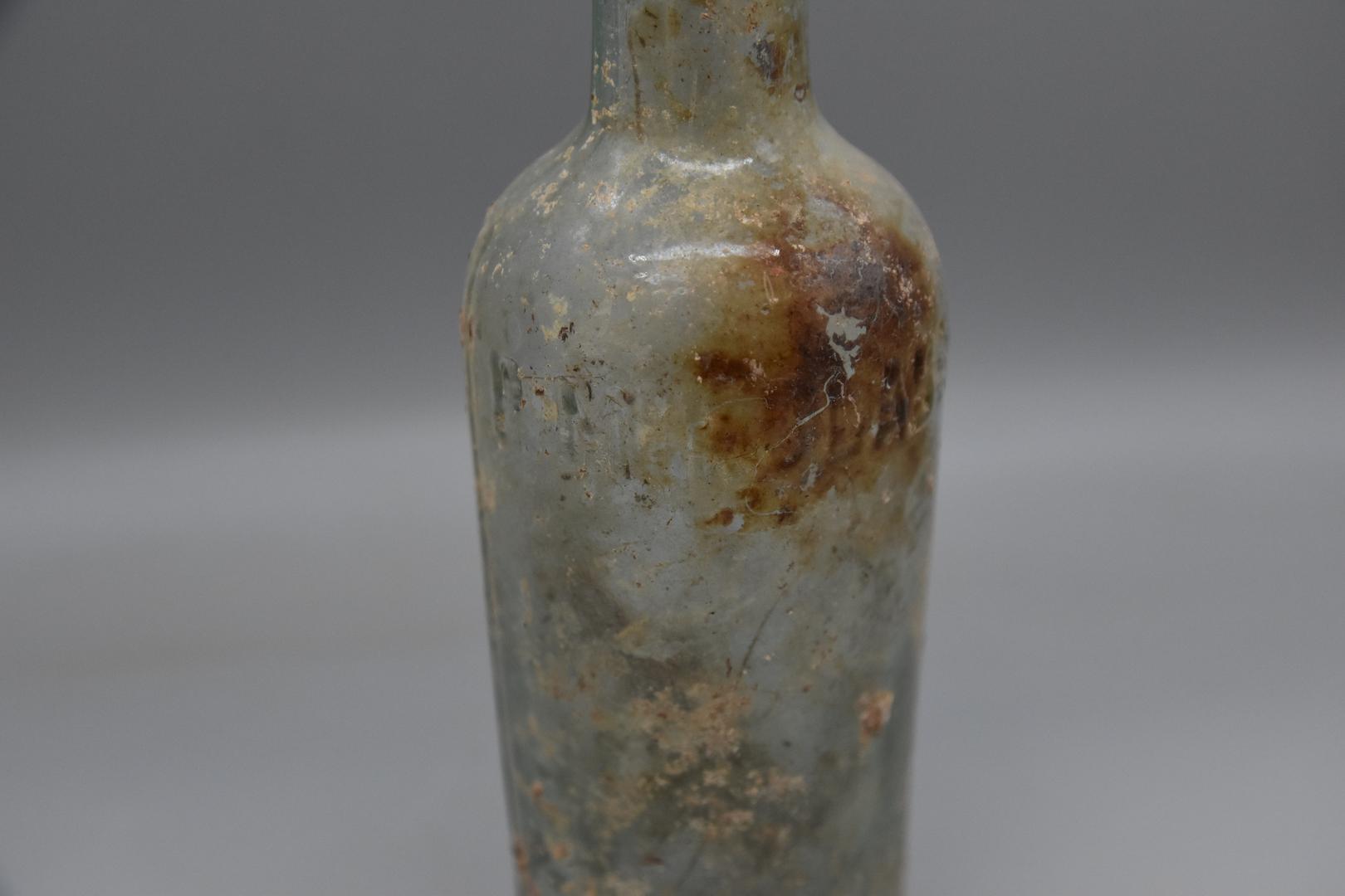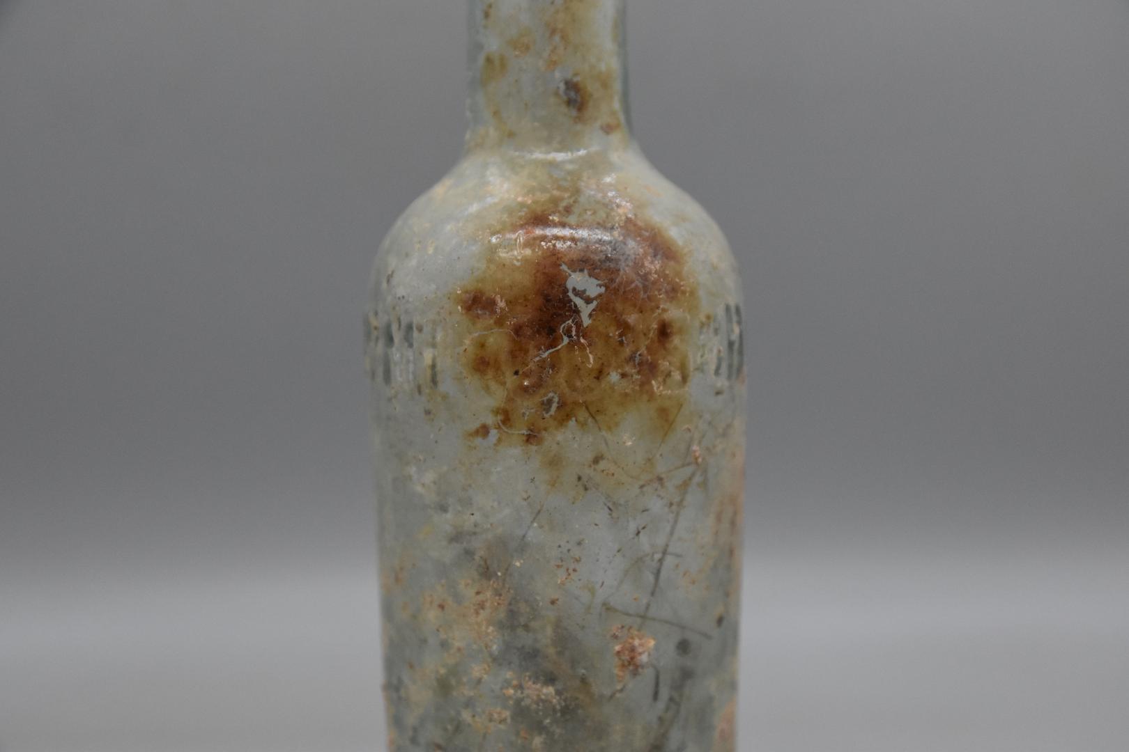 Die Glasflasche ist zylindrisch und die Flaschenöffnung ist schmal. Die Schulter ist ausladend und der Boden ist leicht nach innen gezogen. Auf der Flasche befinden sich noch Etikettreste.