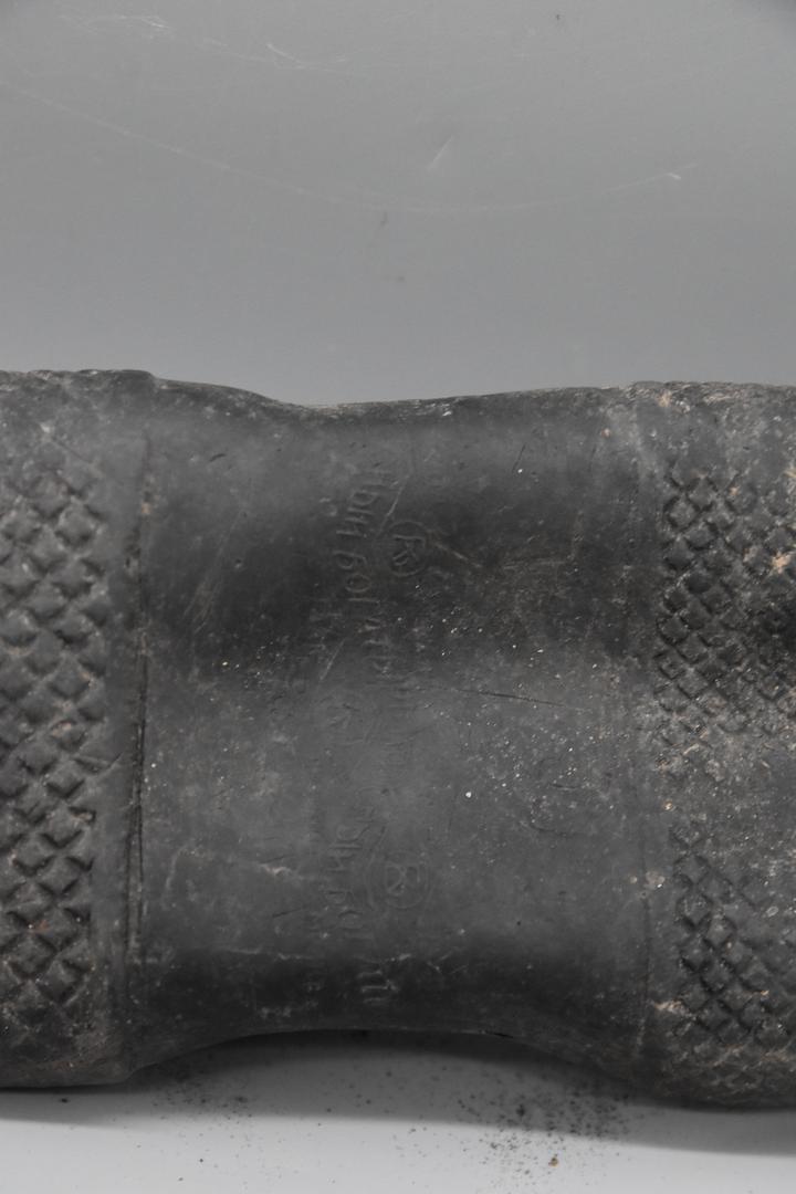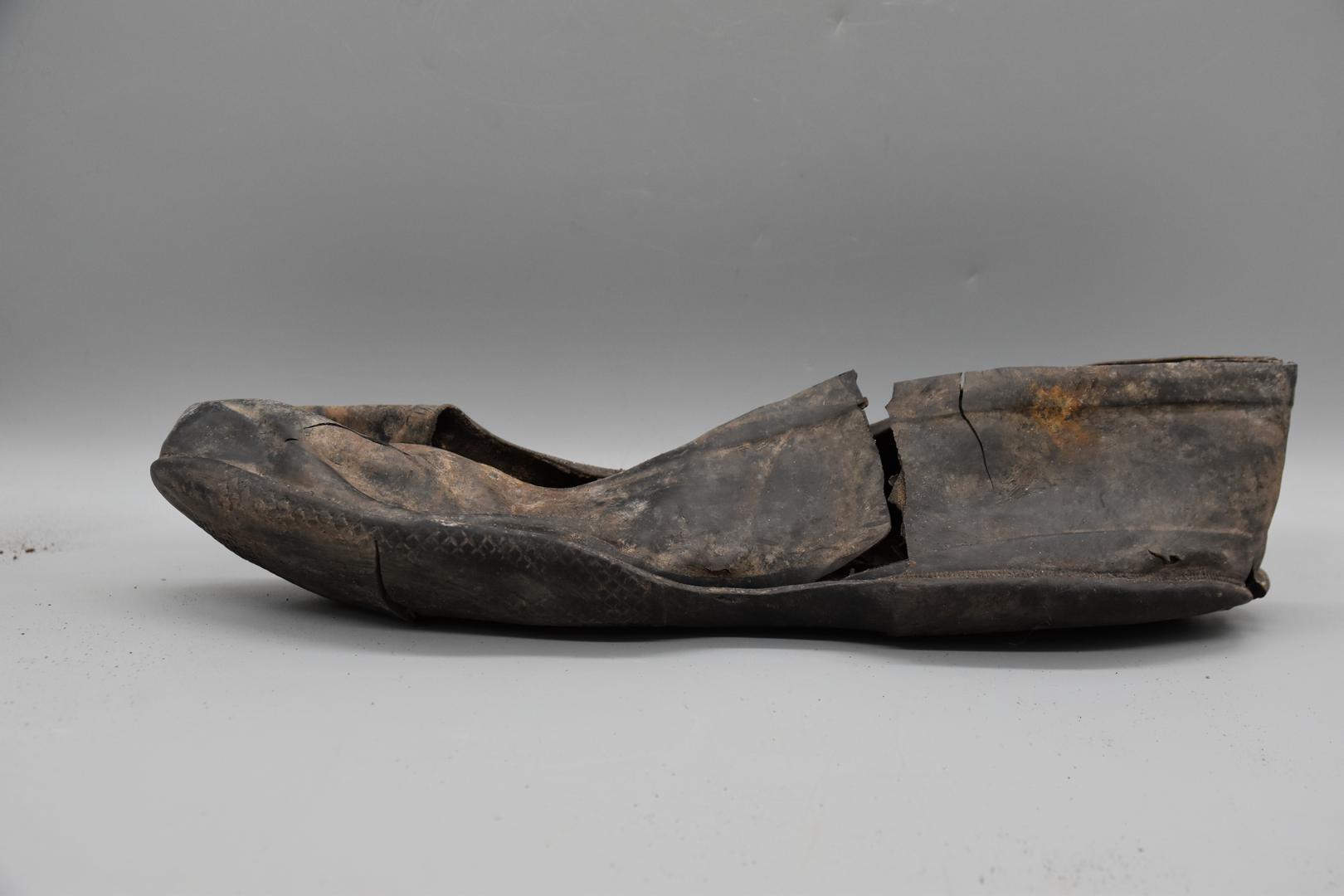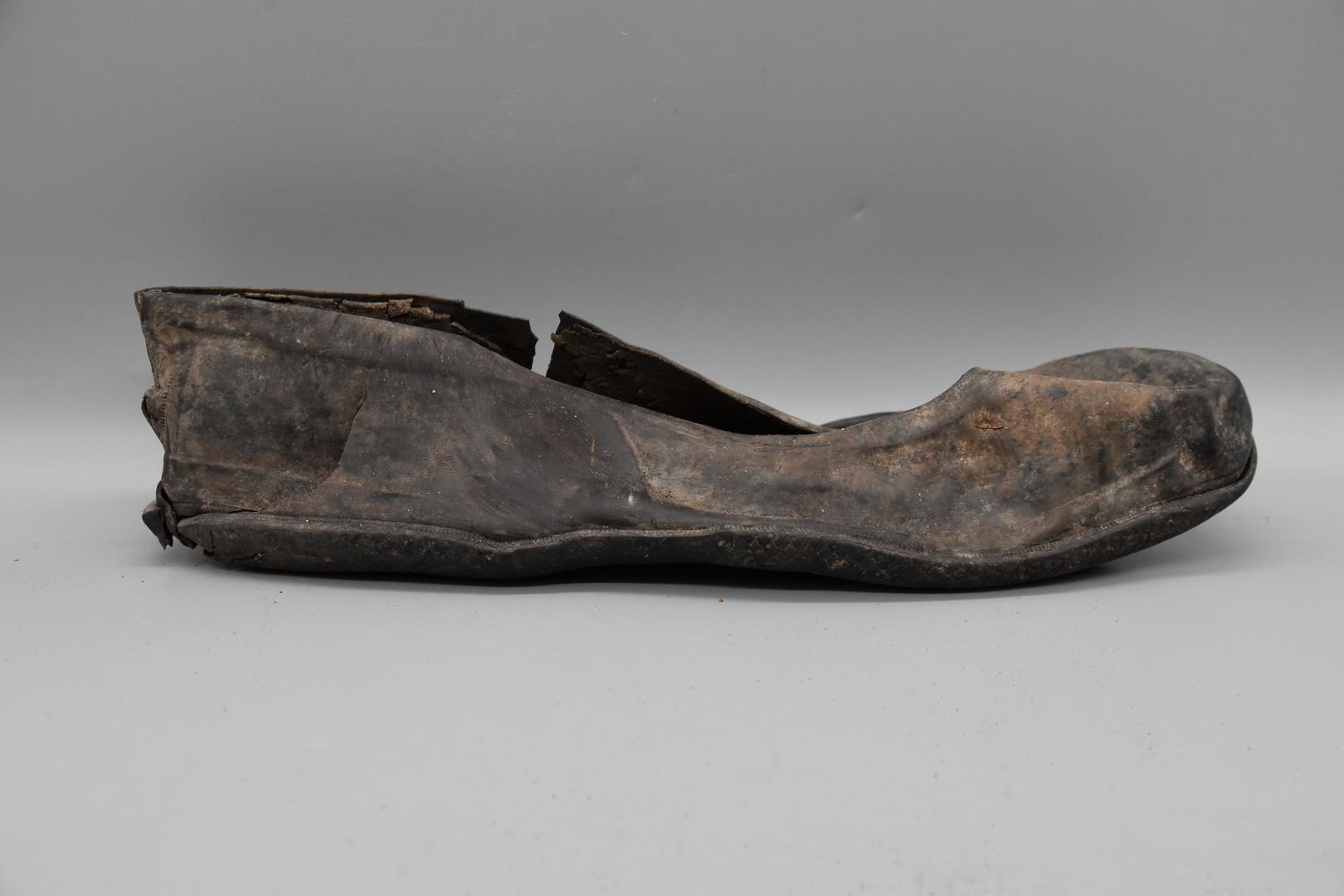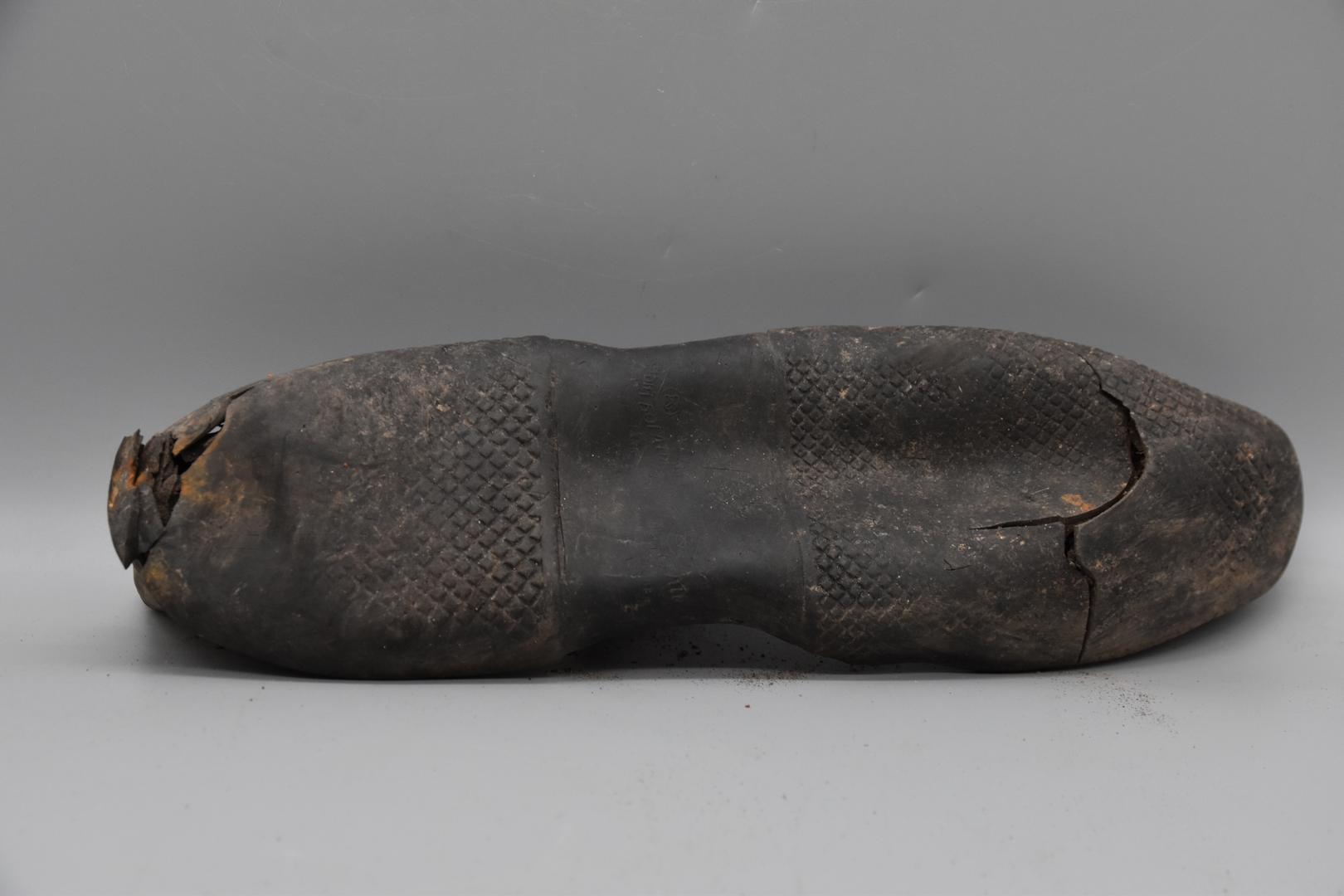 Ein sehr großer schwarzer Halbschuh aus Gummi. Der Schuh hat eine profilierte Sohle. In der Mitte der Sohle befindet sich eine kyrillische Prägung. Die Oberfläche des Schuhes ist glatt und die Sohle ist flach.