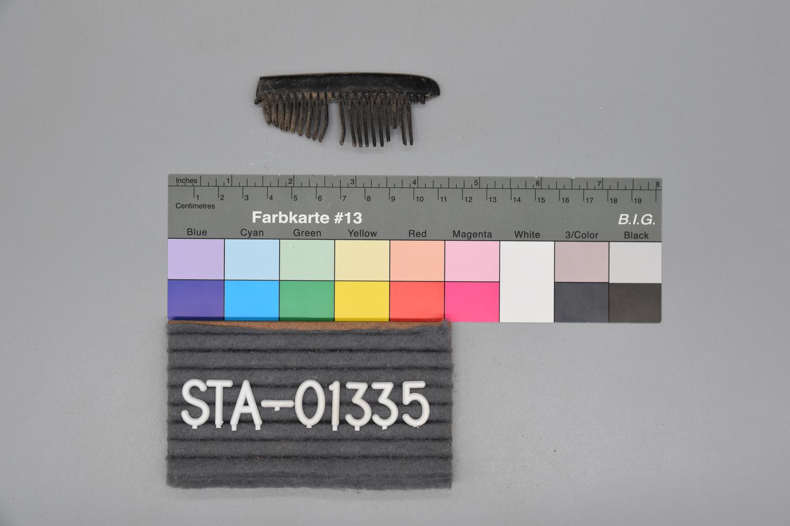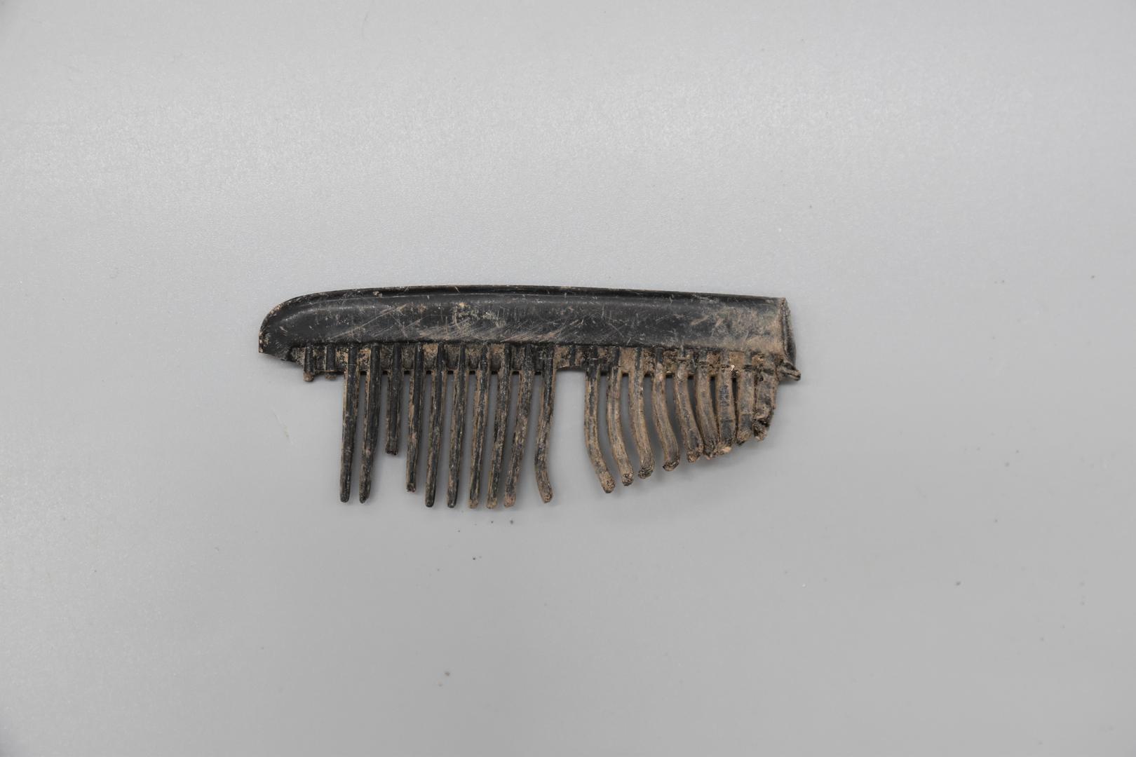 Der Kamm ist schwarz und rechteckig. Die Griffkanten sind abgerundet. Der Kamm hat verbogene Kammzähne in der Mitte und ist nicht vollständig erhalten.