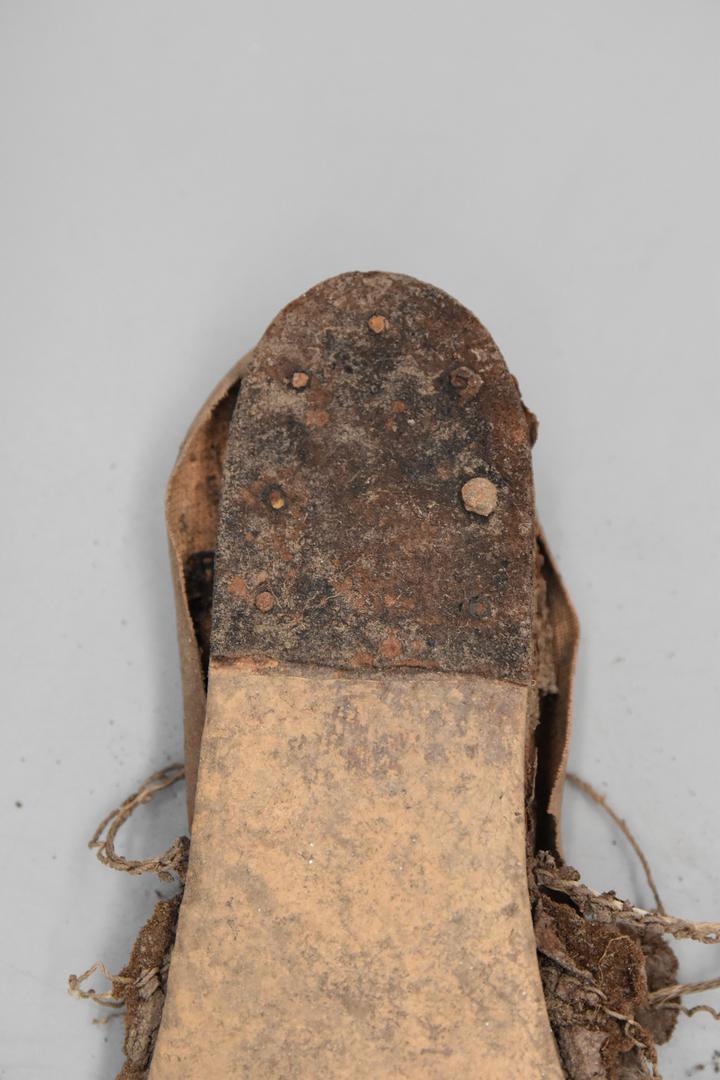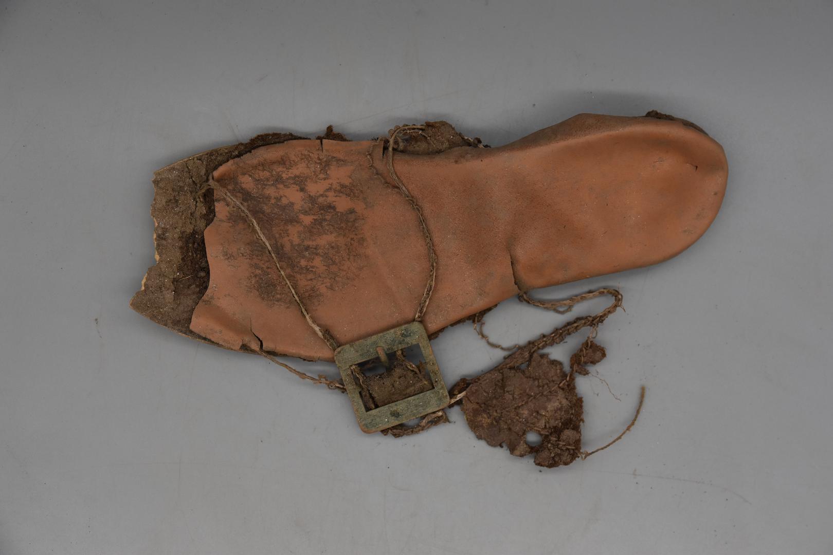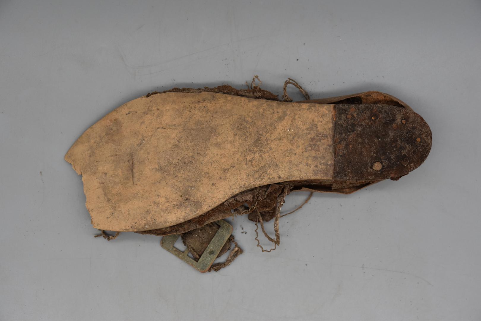 "de": "Der Frauenschuh hat eine mittelbraune Obersohle. Eine rechteckige Schnalle aus Metall mit Dorn hängt an einer dünnen Schnur und Lederreste sind anhaftend. Der Boden ist glatt und besitzt einen dünnen, dunkelbraunen Absatz in dem Nägel eingeschlagen sind."