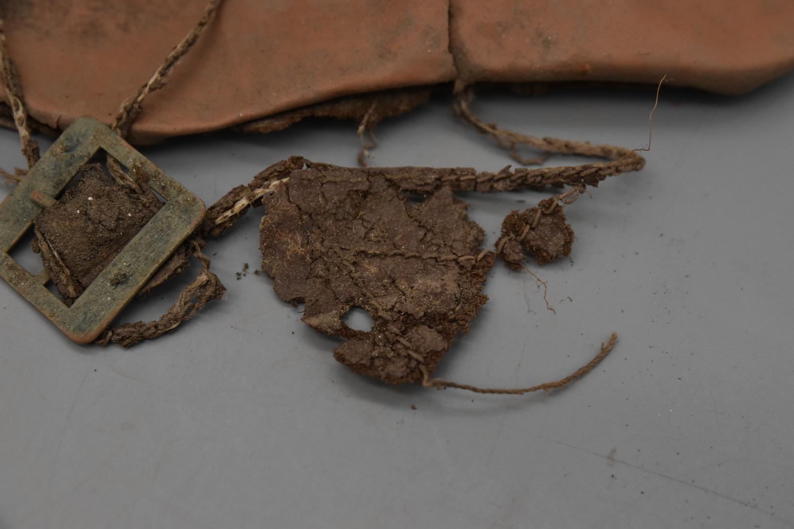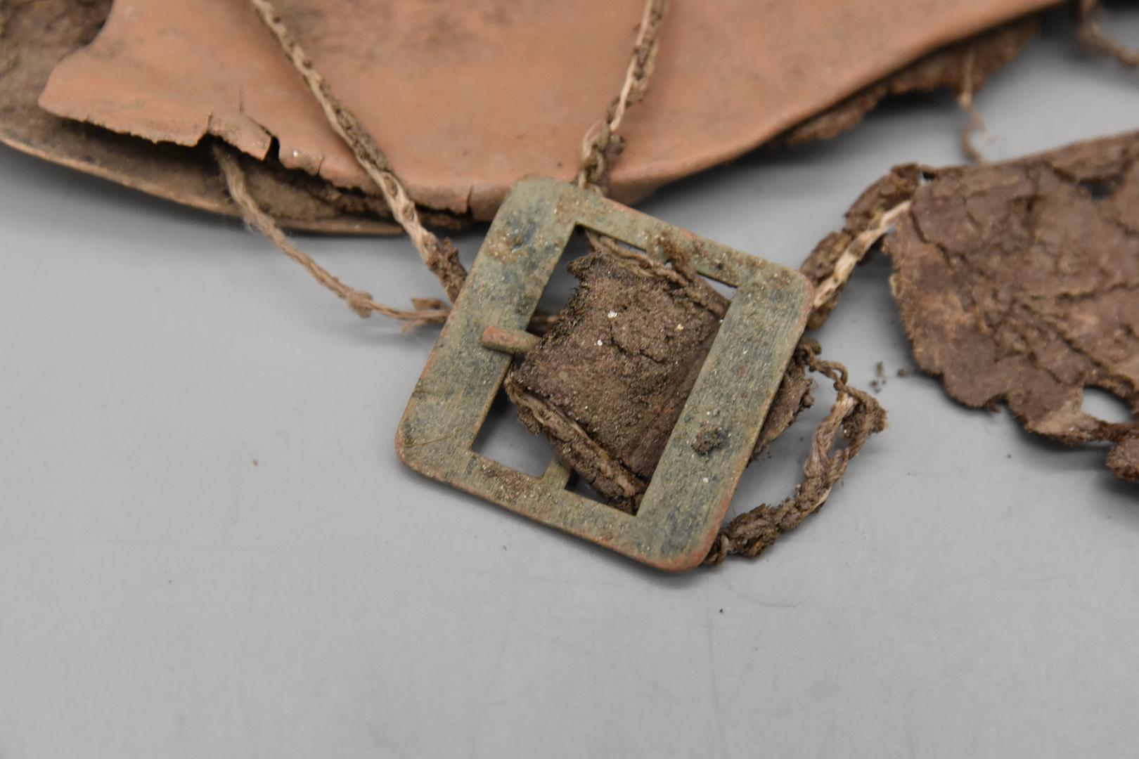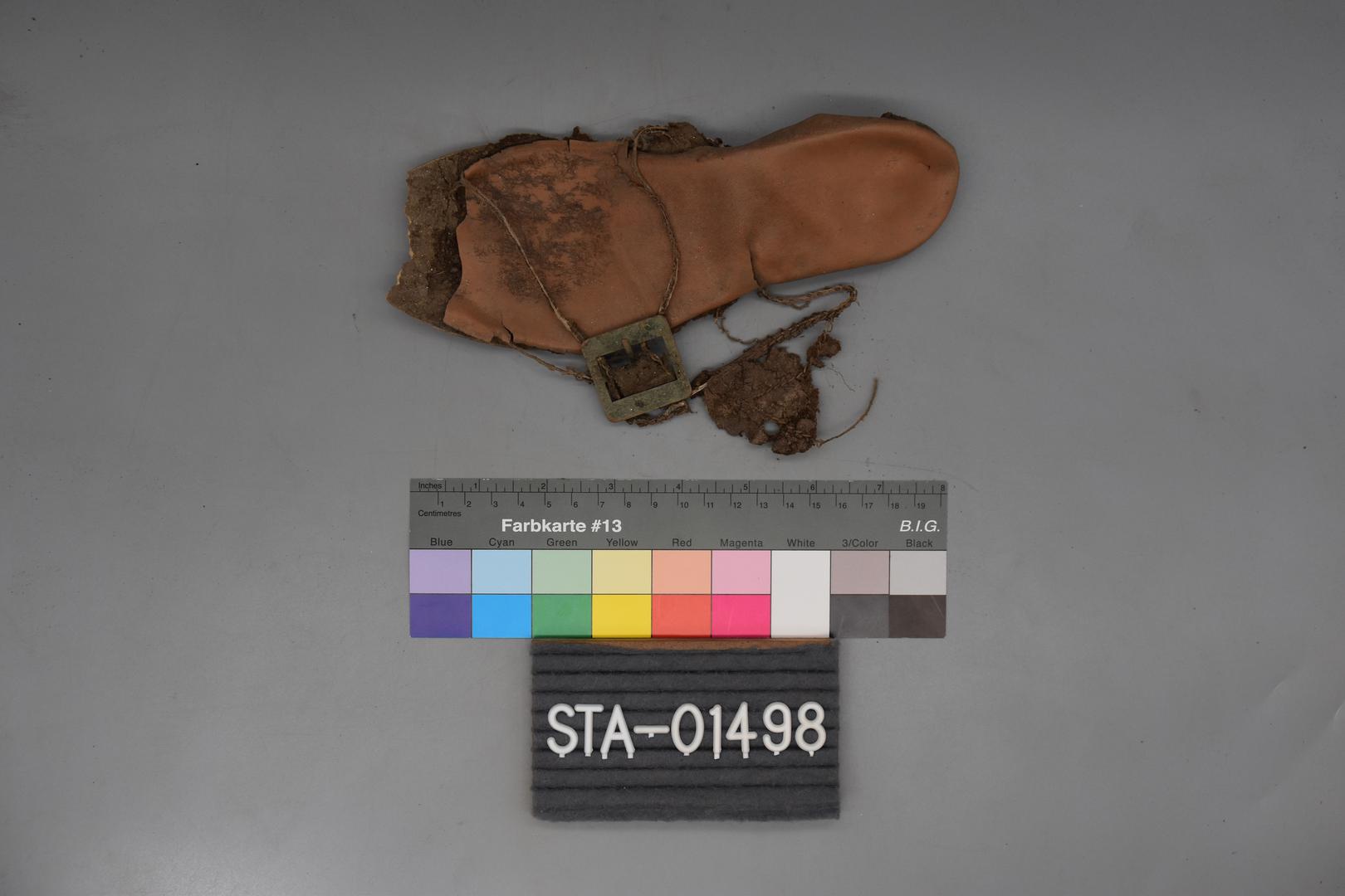"de": "Der Frauenschuh hat eine mittelbraune Obersohle. Eine rechteckige Schnalle aus Metall mit Dorn hängt an einer dünnen Schnur und Lederreste sind anhaftend. Der Boden ist glatt und besitzt einen dünnen, dunkelbraunen Absatz in dem Nägel eingeschlagen sind."