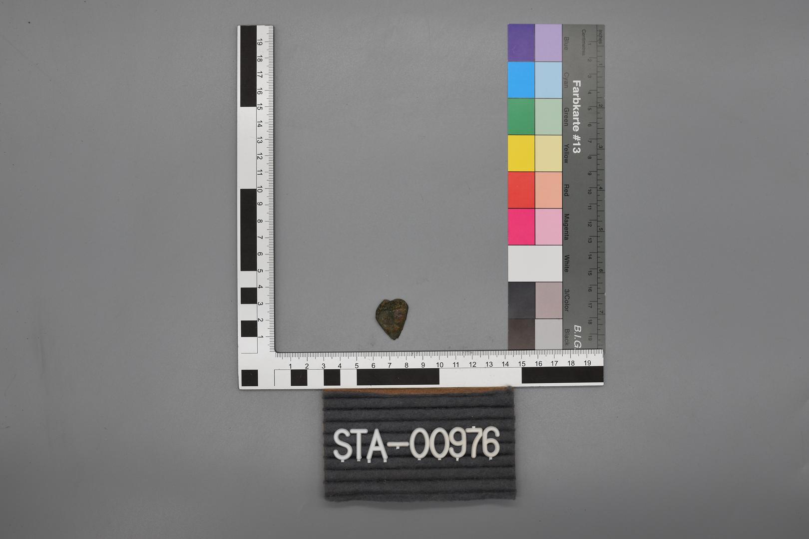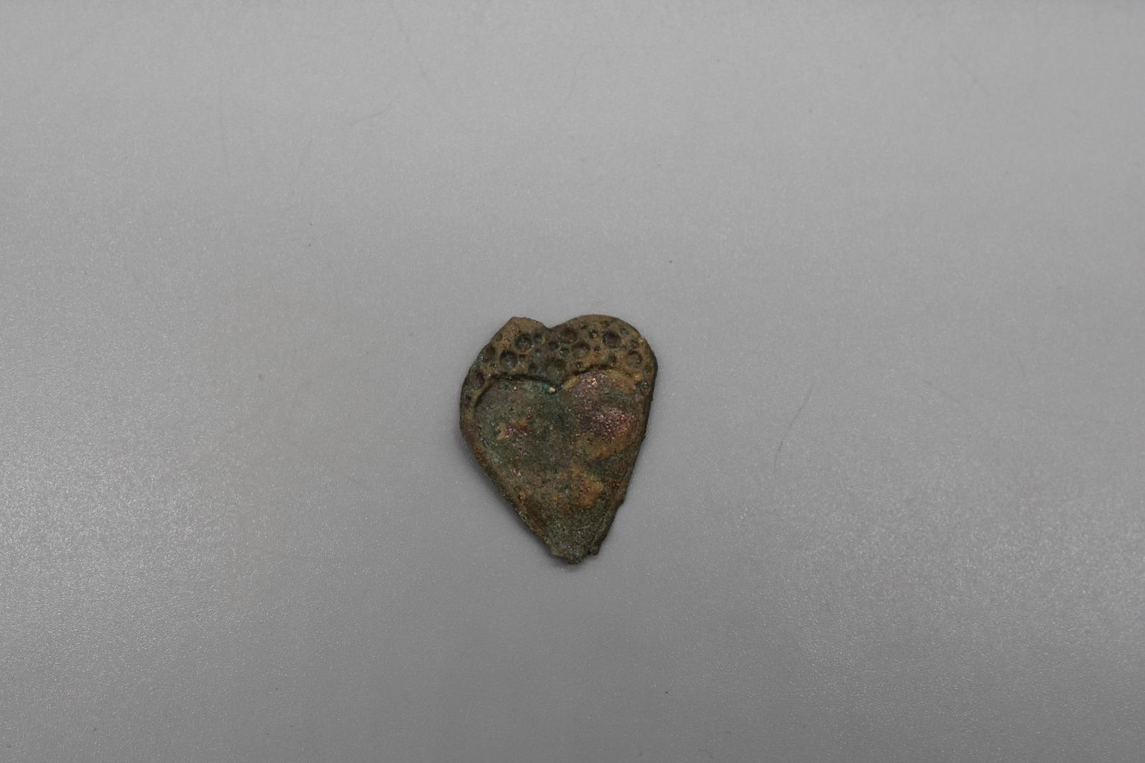 Die Applike ist herzförmig und sehr dünn. Vertikale vertiefte Linie verlaufen durch die Herzform. Im oberen Bereich sind kreisrunde Vertiefungen sichtbar.