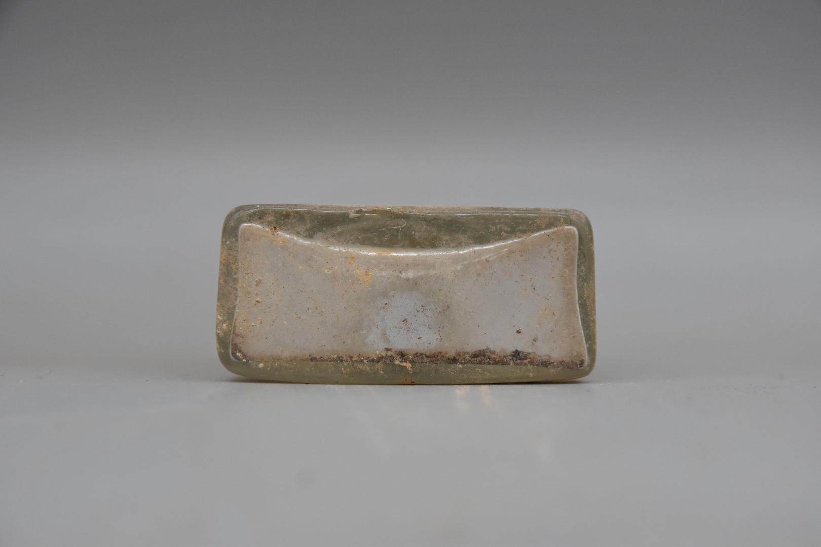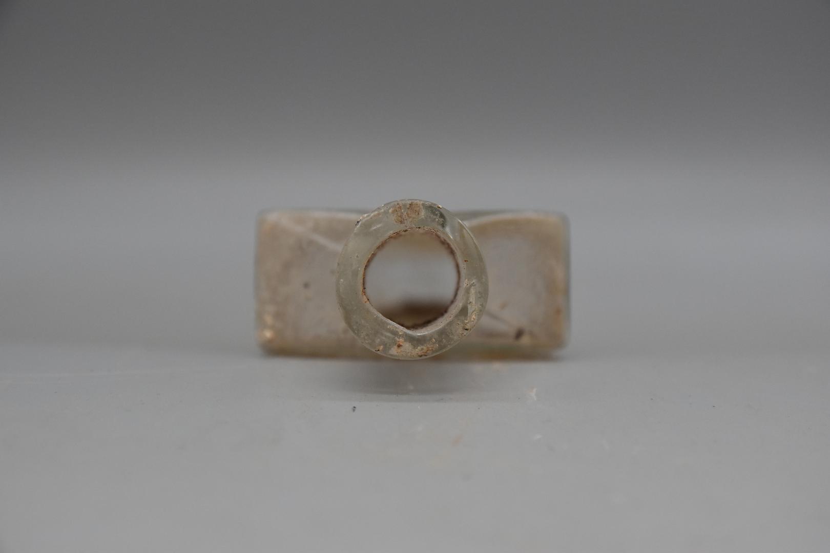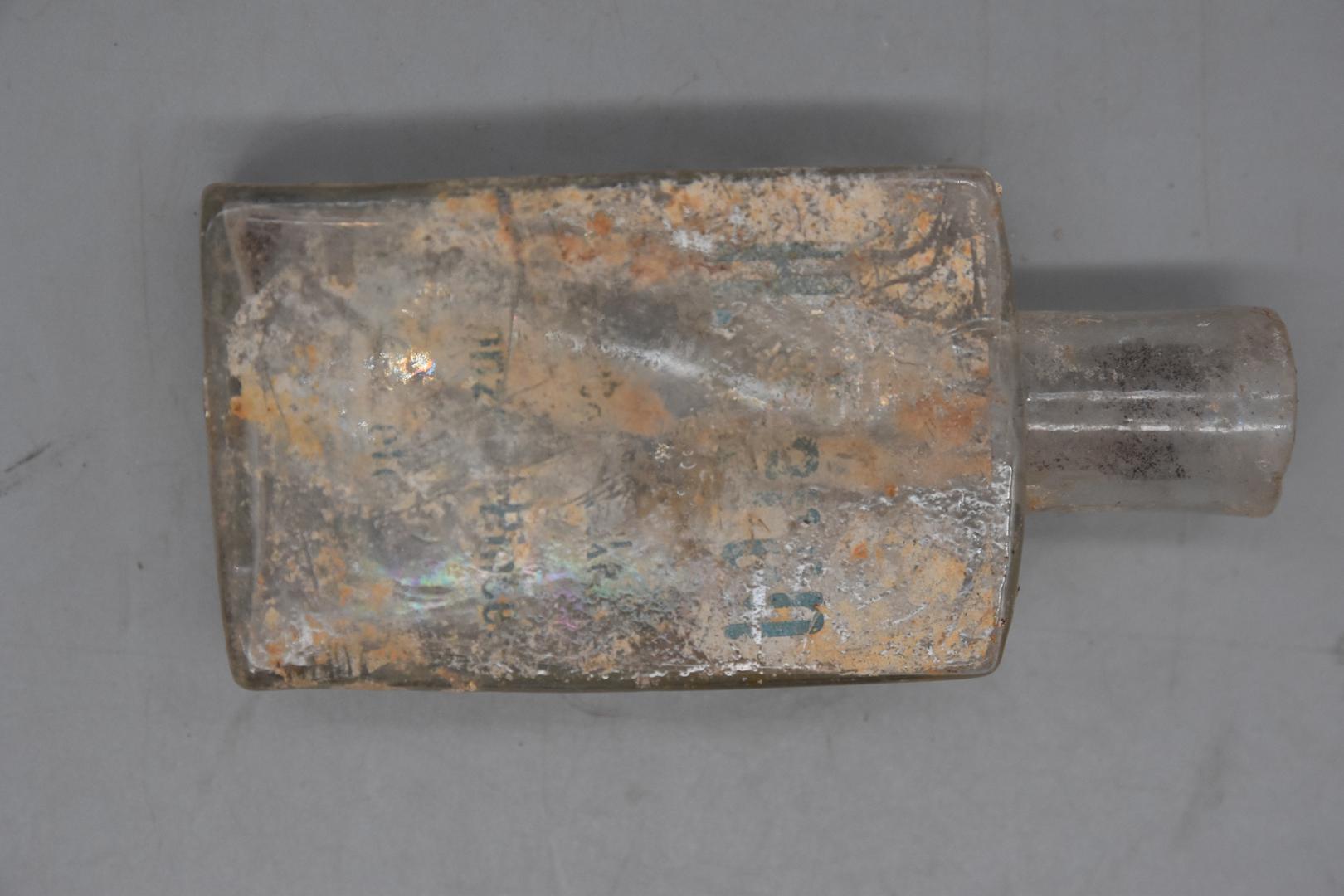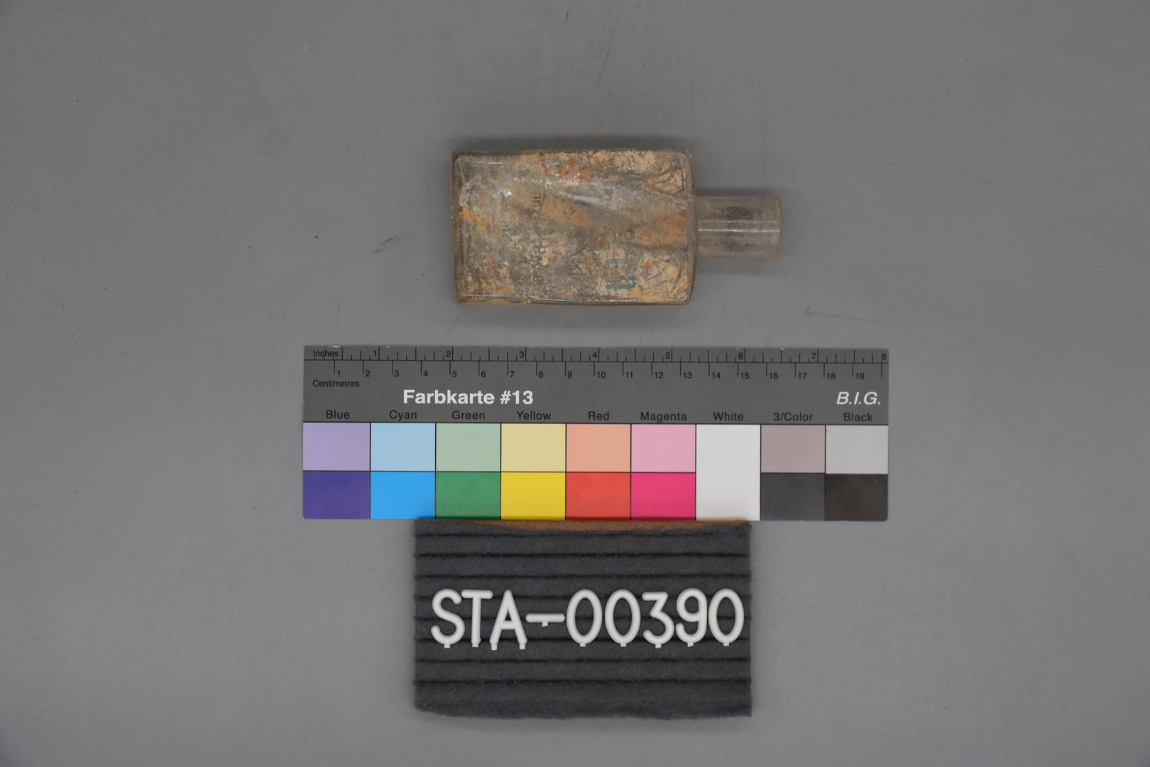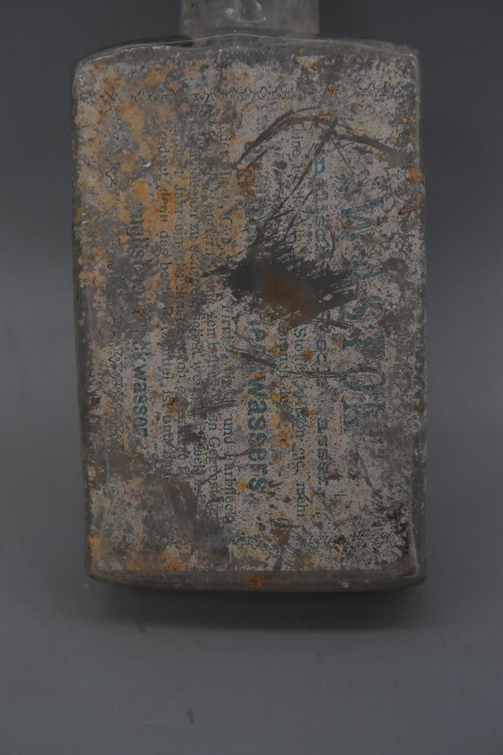 Eine rechteckige Glasflasche mit einem langen, breiten und runden Hals und einer abgesetzten Schulter. Die Mündung ist unregelmäßig geformt. Auf allen vier Körperseiten sind Etikettreste erhalten.