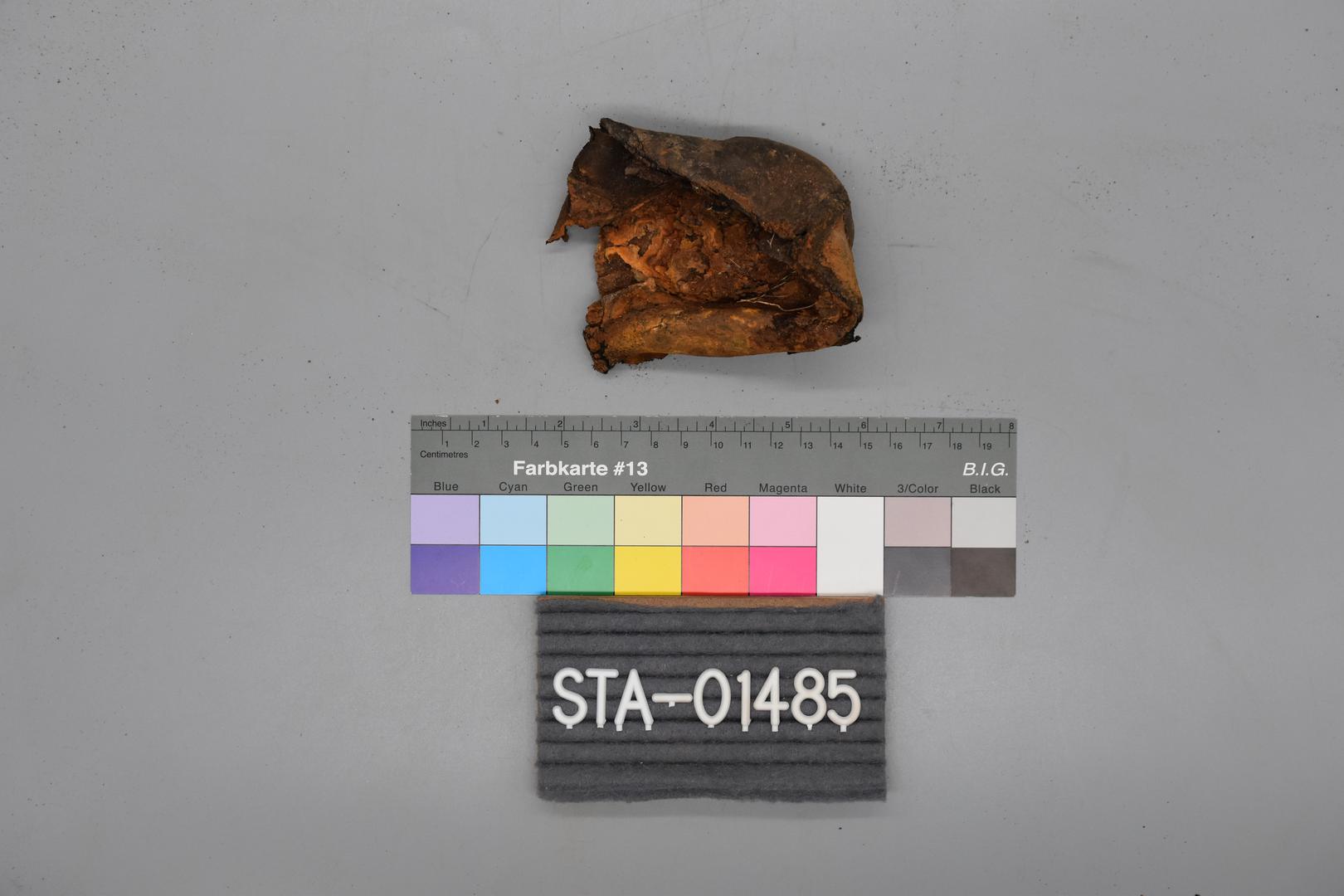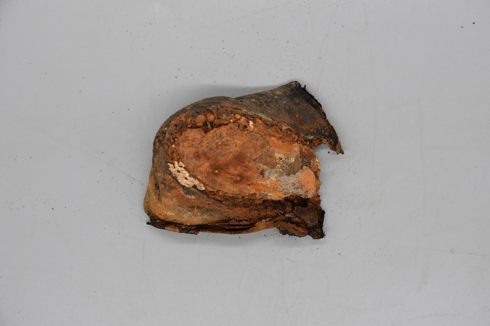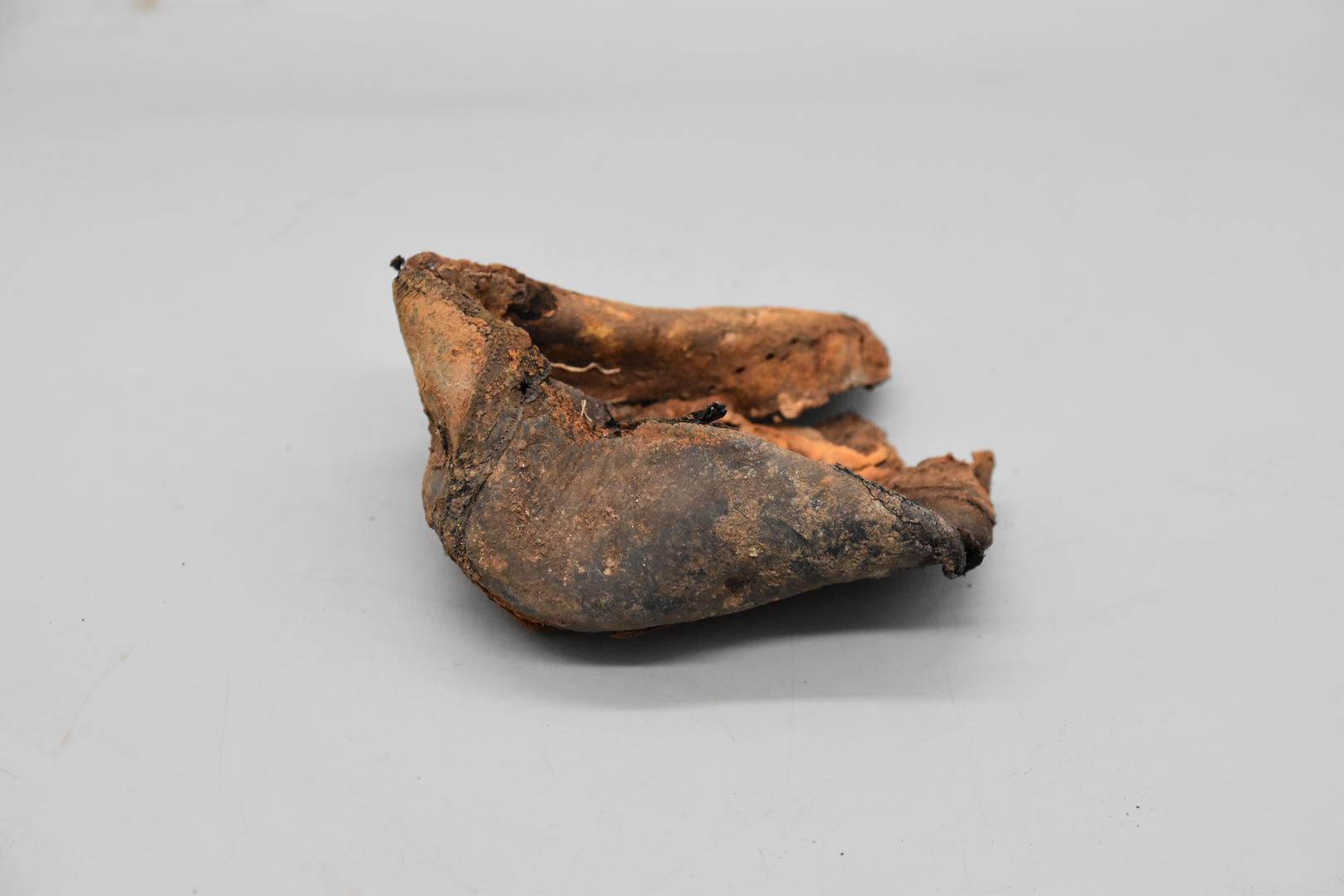 "de": "Vom dunkelbraunen Lederschuh ist nur noch ein Fersenteil erhalten. Der Schuh ist schmal, womöglich ein Frauenschuh. An der erhaltenen Sohle befinden sich Holzreste."