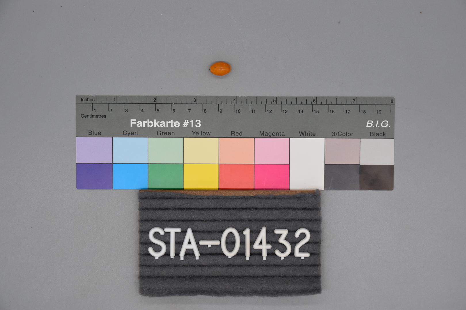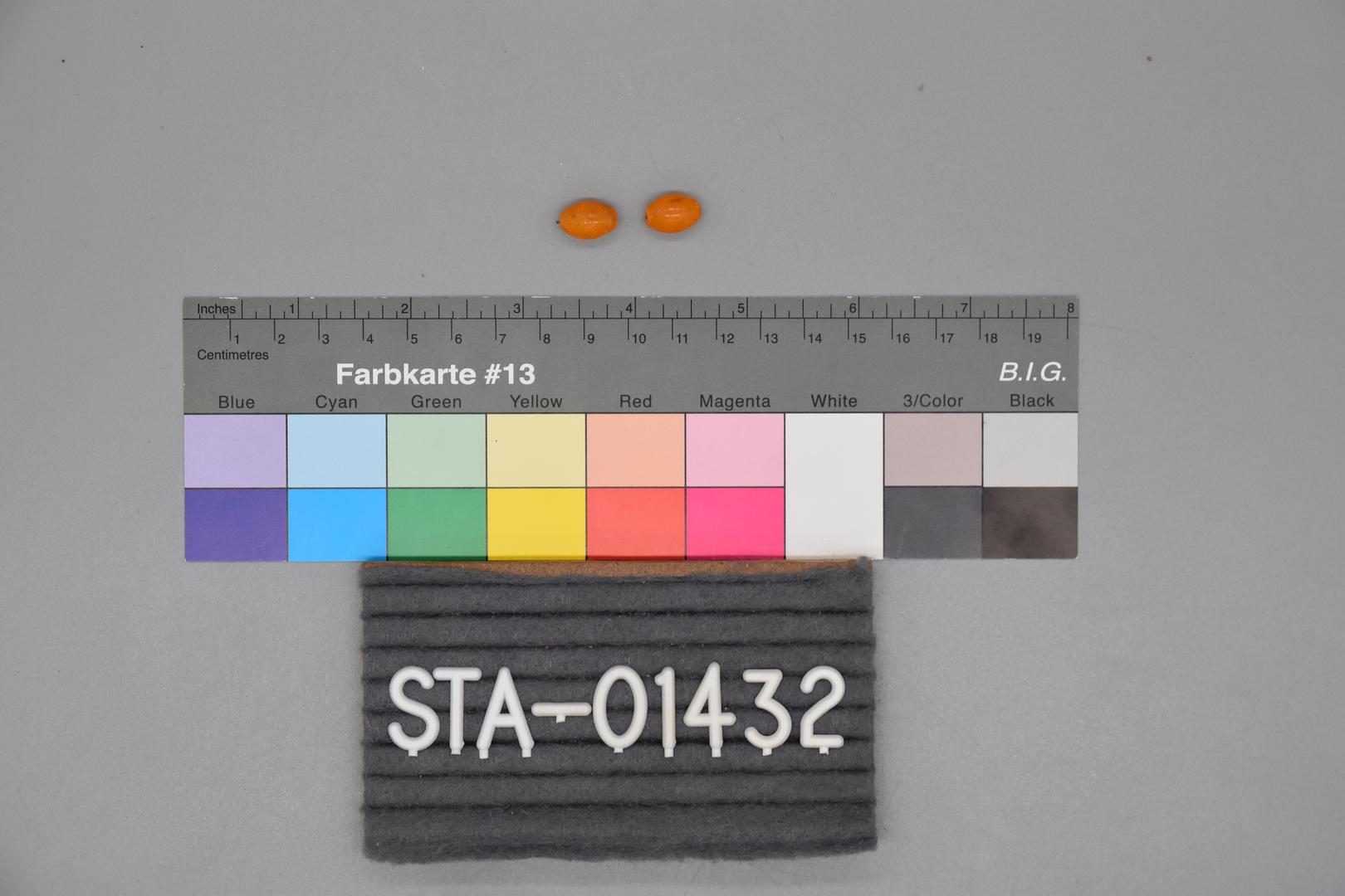 Zwei orange Perlen, wobei in einer Perle ein Draht erhalten ist. Die zwei Perlen gehören vermutlich zusammen zu einer Kette. Die Perlen sind oval mit einem Loch in der Mitte.