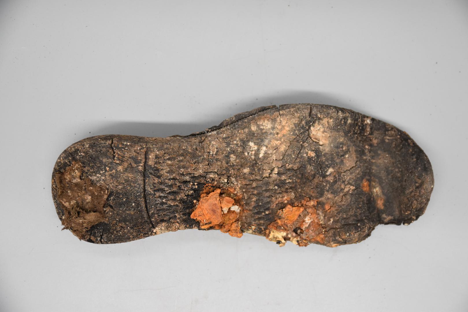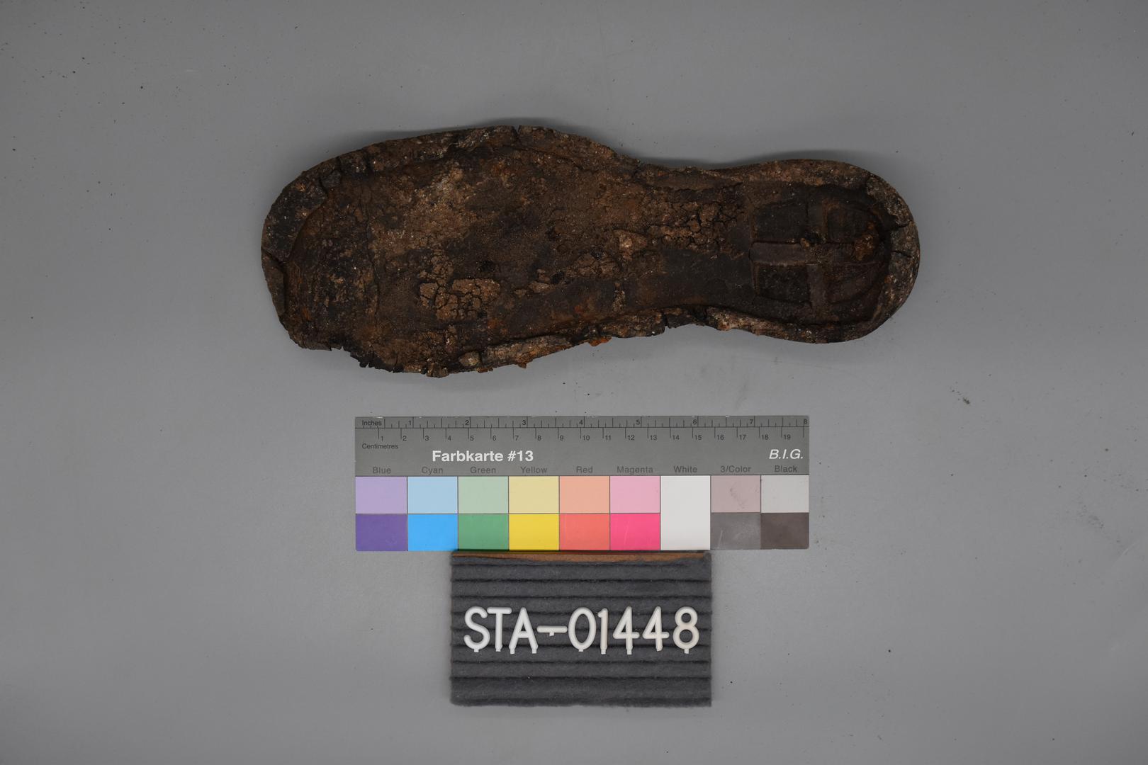 "de": "Eine dunkelbraune Gummisohle. Die Sohle ist vollständig und leicht deformiert. Die Unterseite weist ein Rautenmuster auf. Die Oberseite hat im Fersenbereich eine geschlossene und stark vertiefte Rundbogenform. Die Seitenkanten sind dick und leicht nach innen gewölbt. Auf einer Seite befindet sich an der Unterseite der Ferse ein Stück Textilrest. Es sind Nägel in der Schuhsohle."