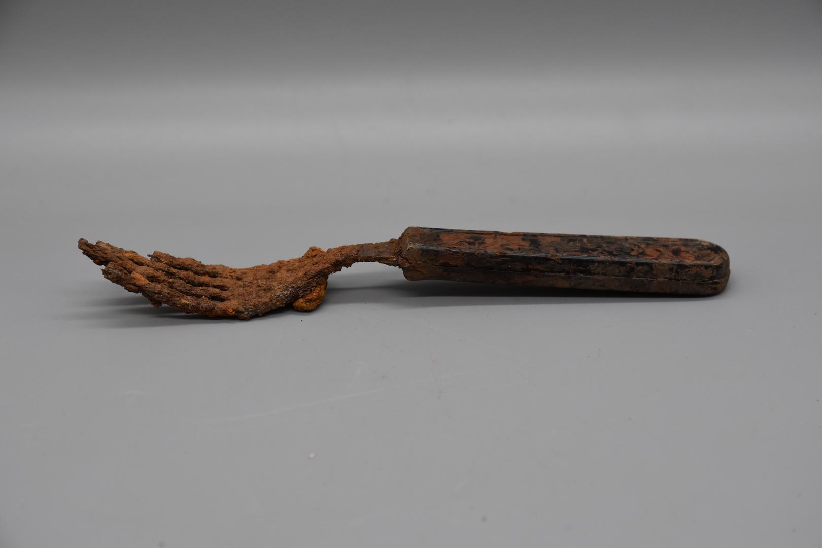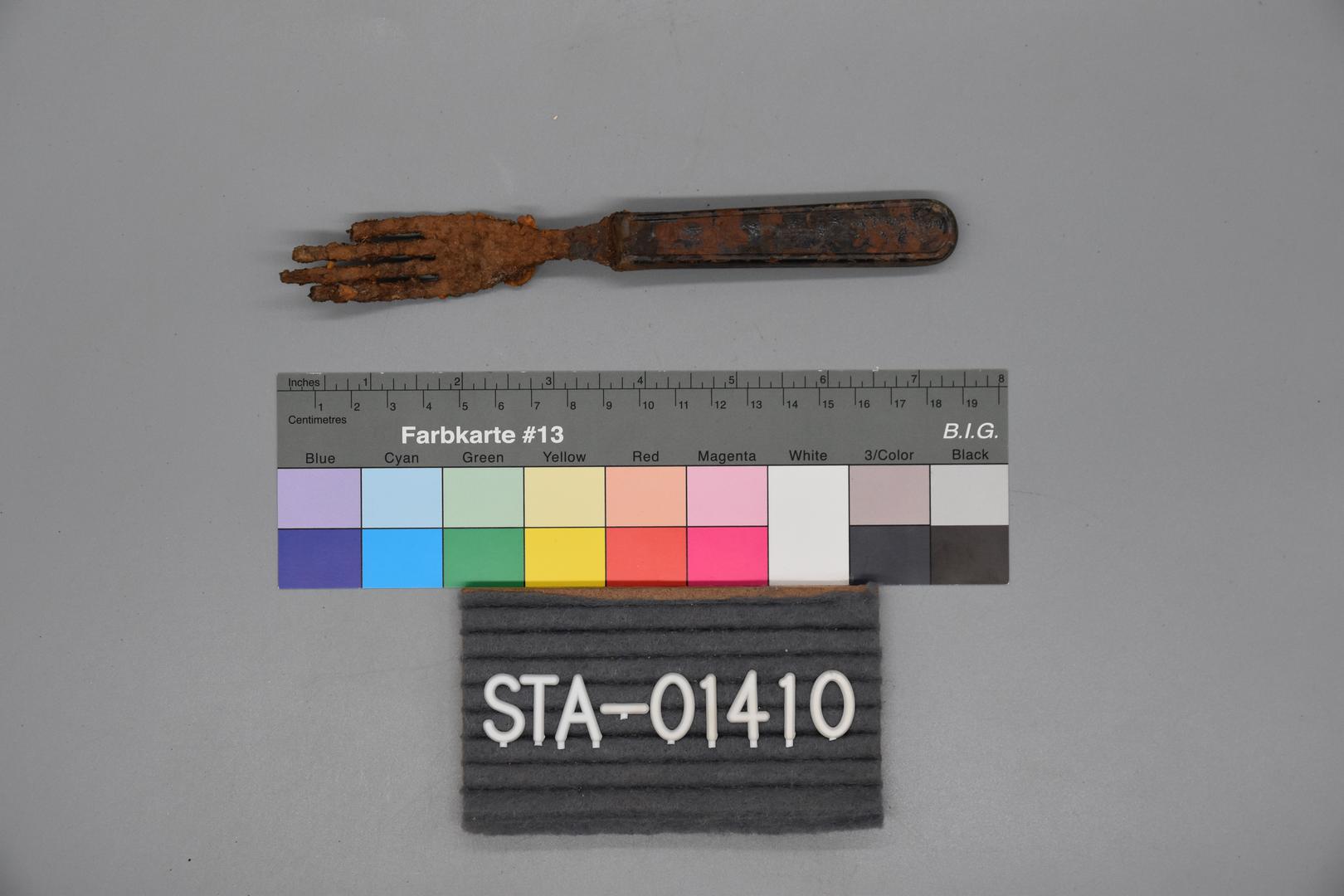 Die Gabel hat einen schwarzen Kunststoffgriff der rechteckig geormt ist und am Ende abgerundet ist.