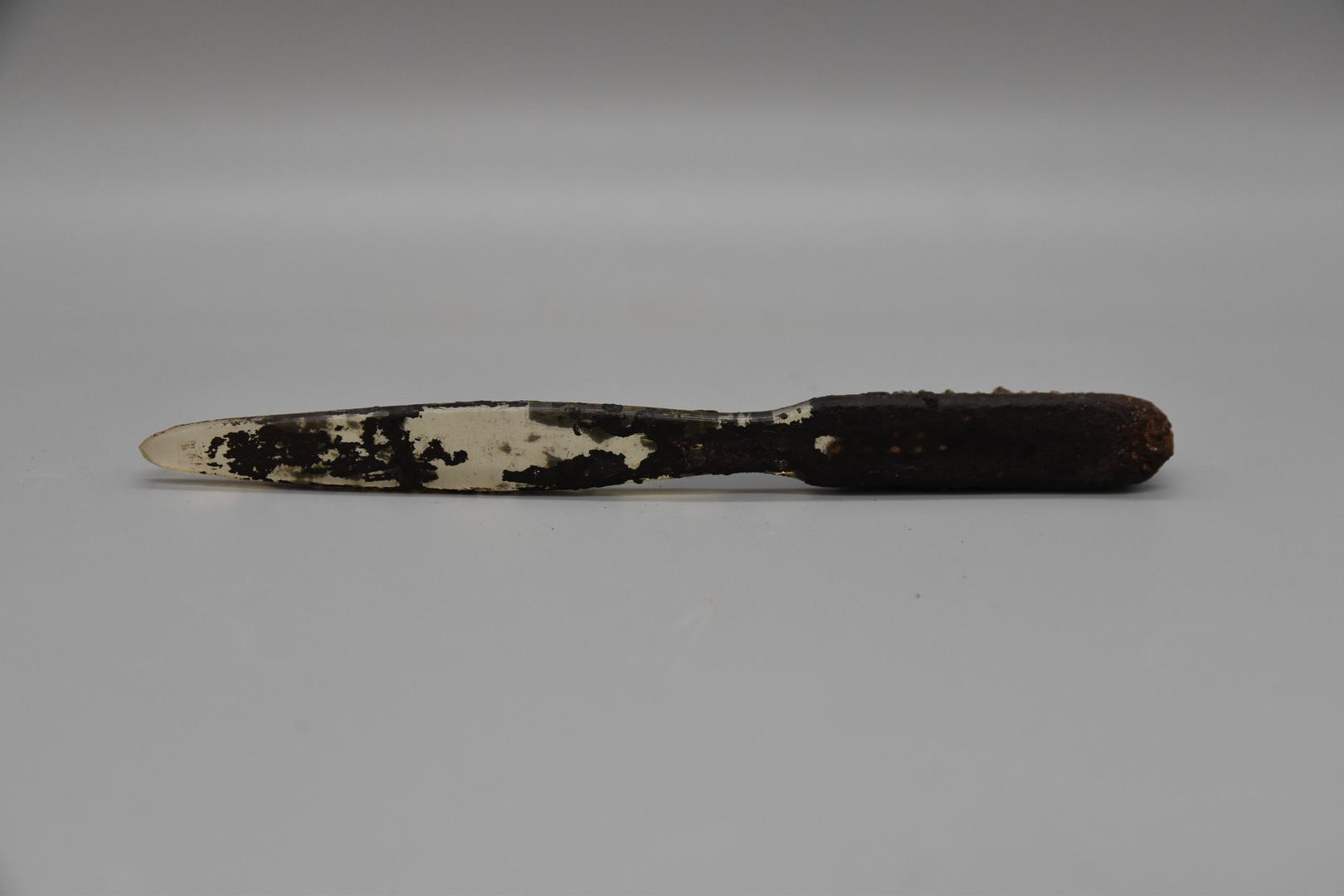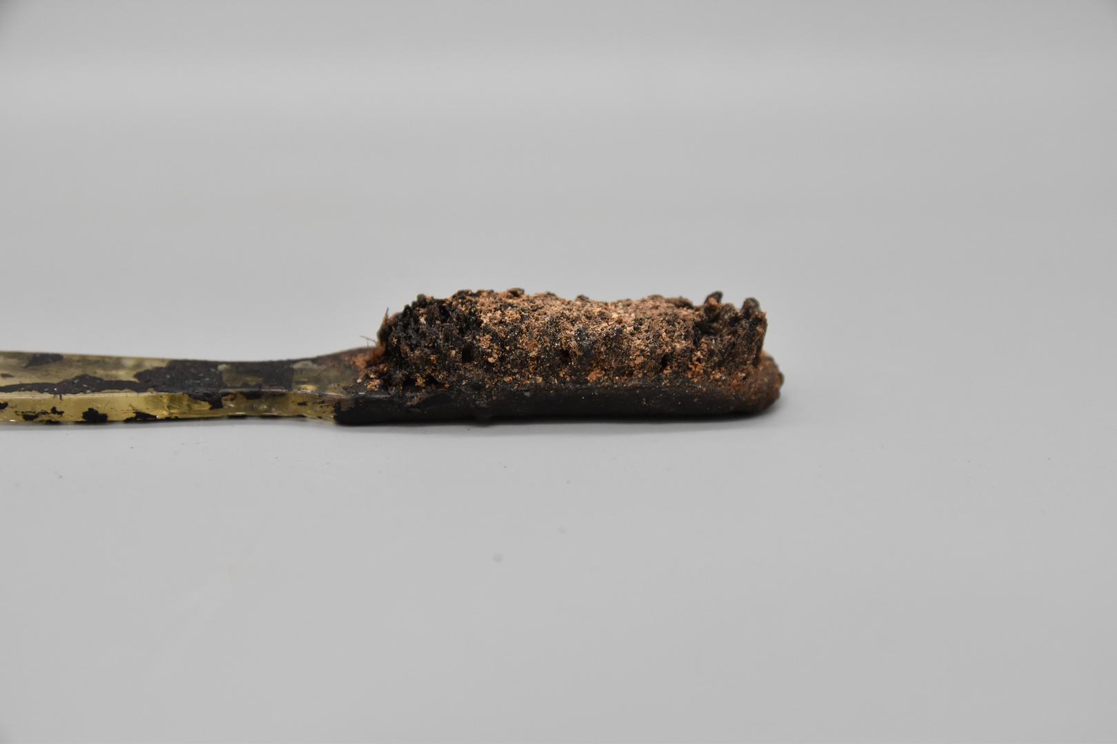 "de": "Die Zahnbürste ist gelb-beige und leicht transparent. Der Kopf ist breit und lang, und die Borsten sind noch erhalten, aber stark verschmutzt. Der Griff verjüngt sich nach unten und läuft spitz zusammen. Die Kanten sind leicht abgerundet. Die Zahnbürste hat einen schwarzen Überzug aus einem unbekannten Material."