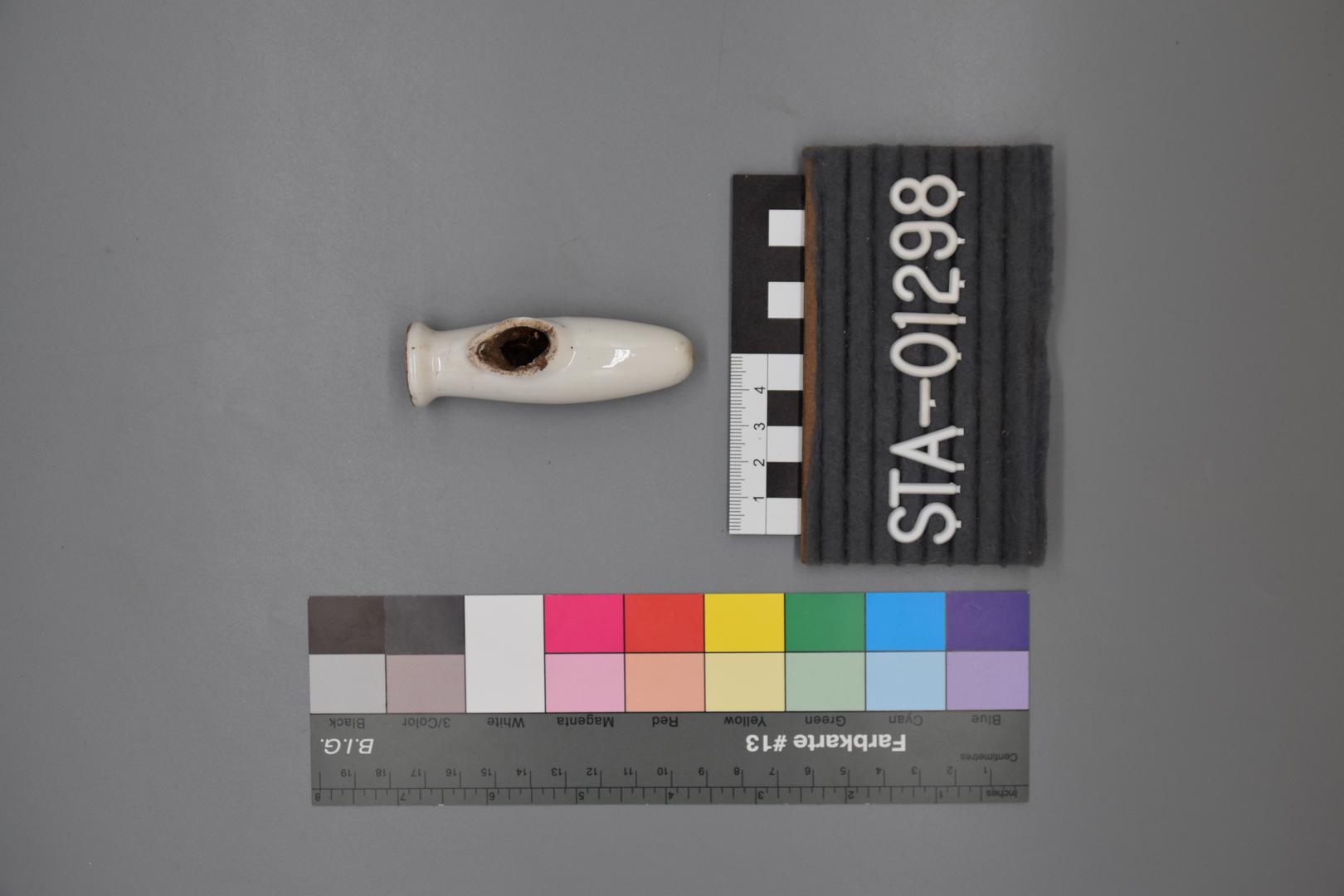 Die Pfeife ist weiß glasiert und besitzt eine konische Form. Der Rand ist gerade und der Hals ist nach oben hin ausladend.