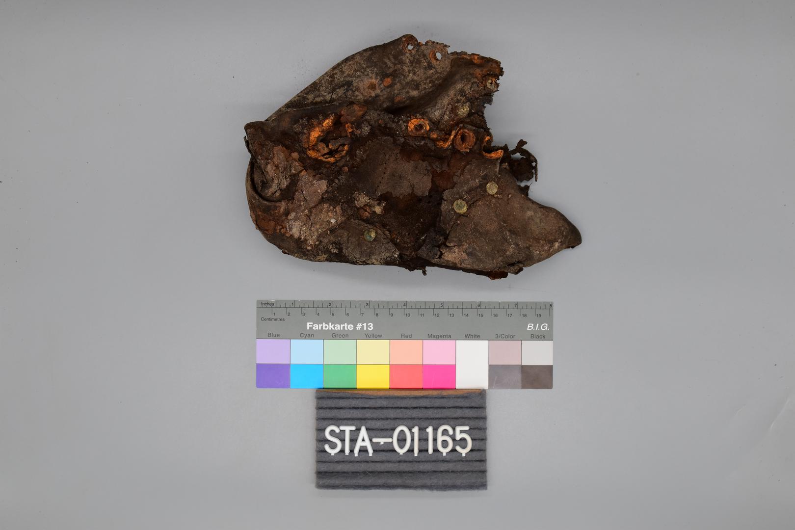 "de": "Ein dunkelbrauner Stiefel aus Leder, Gummi und Metall. Der Stiefel ist im Zehen- und Knöchelbereich beschädigt. Er hat einen Absatz und ist rundum mit Nägeln besetzt. Das Oberleder ist im Schaftbereich weitgehend erhalten. Der Stiefel ist abgerundet, stark verformt, beschädigt und steif."