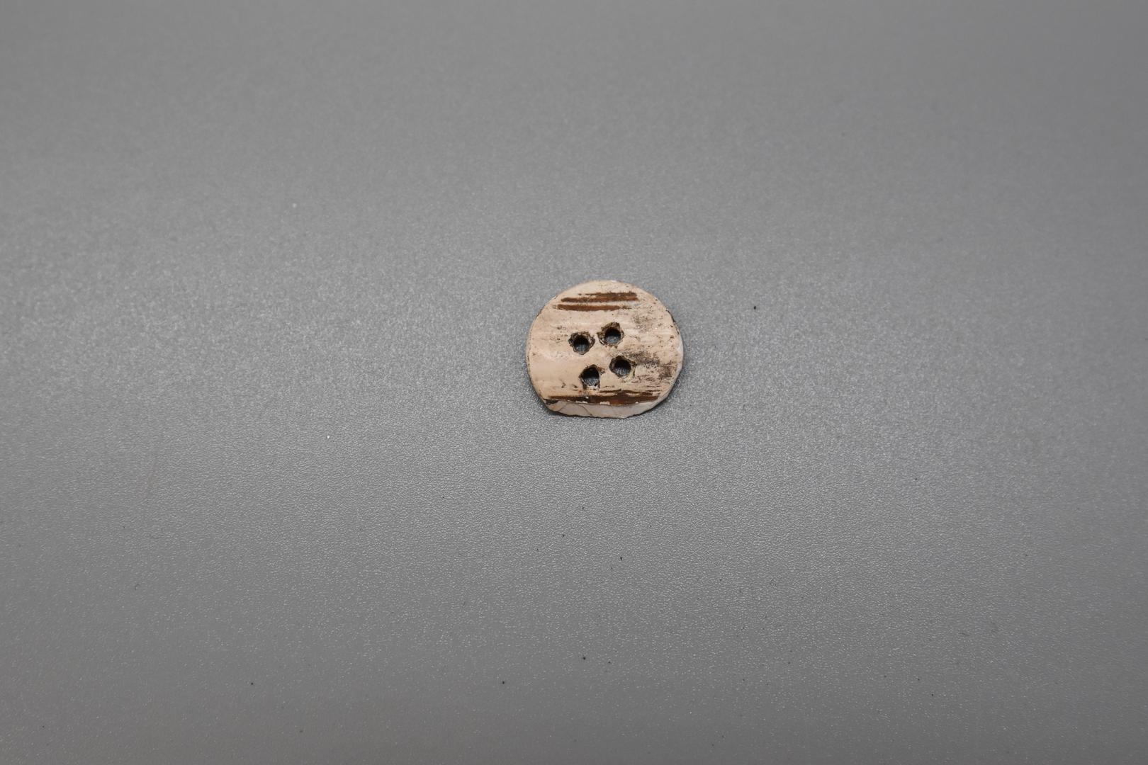 Ein weißer runder Knopf mit vier Löchern. Vom Rand zur Mitte ist er vertieft. Der Rand ist abgerundet. Die Rückseite ist mit Linien profiliert.