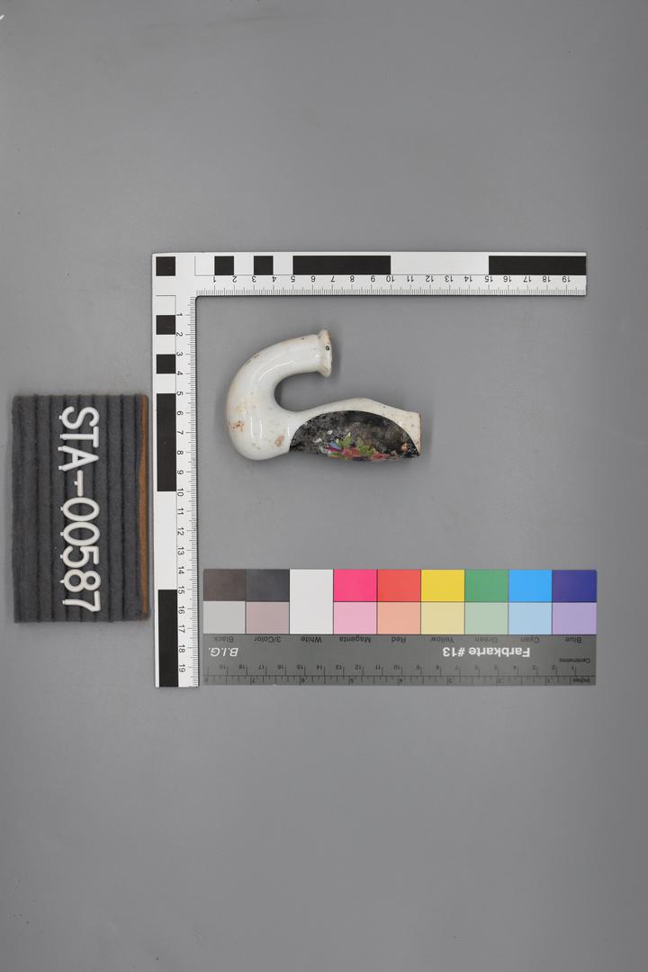 - Die Pfeife hat eine weiße Grundfarbe. Das Blumenmotiv besteht aus weißen, blauen und rosa Blumen mit grünen Blättern. an der Oberseite gebrochen; Mundstück fehlt
