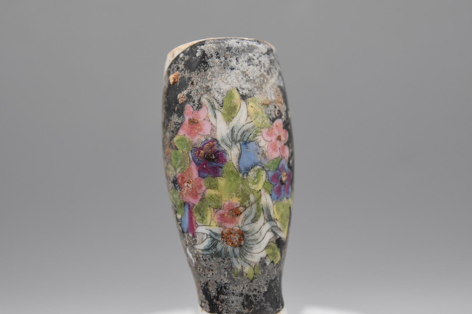 Die Porzellanpfeife hat auf dem Körper eine Blumenbemalung auf schwarzem Hintergrund. Es war einmal ein Metalldeckel befestigt der jedoch fehlt.