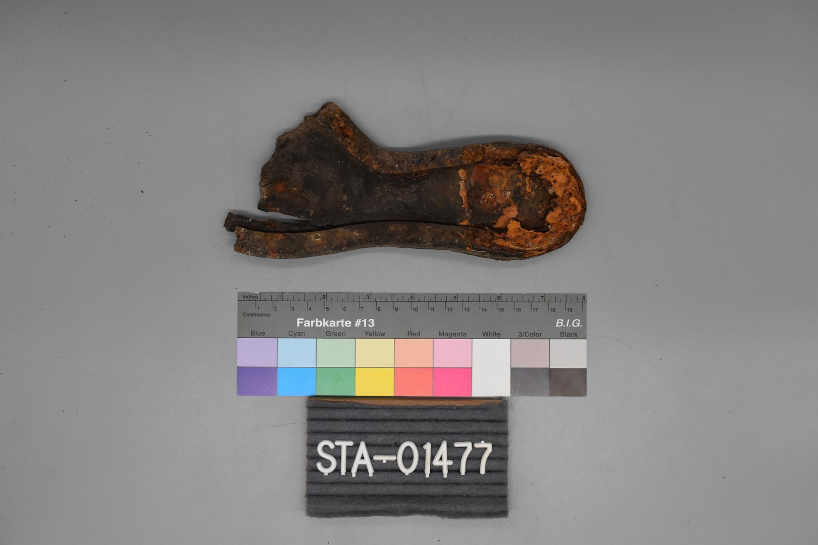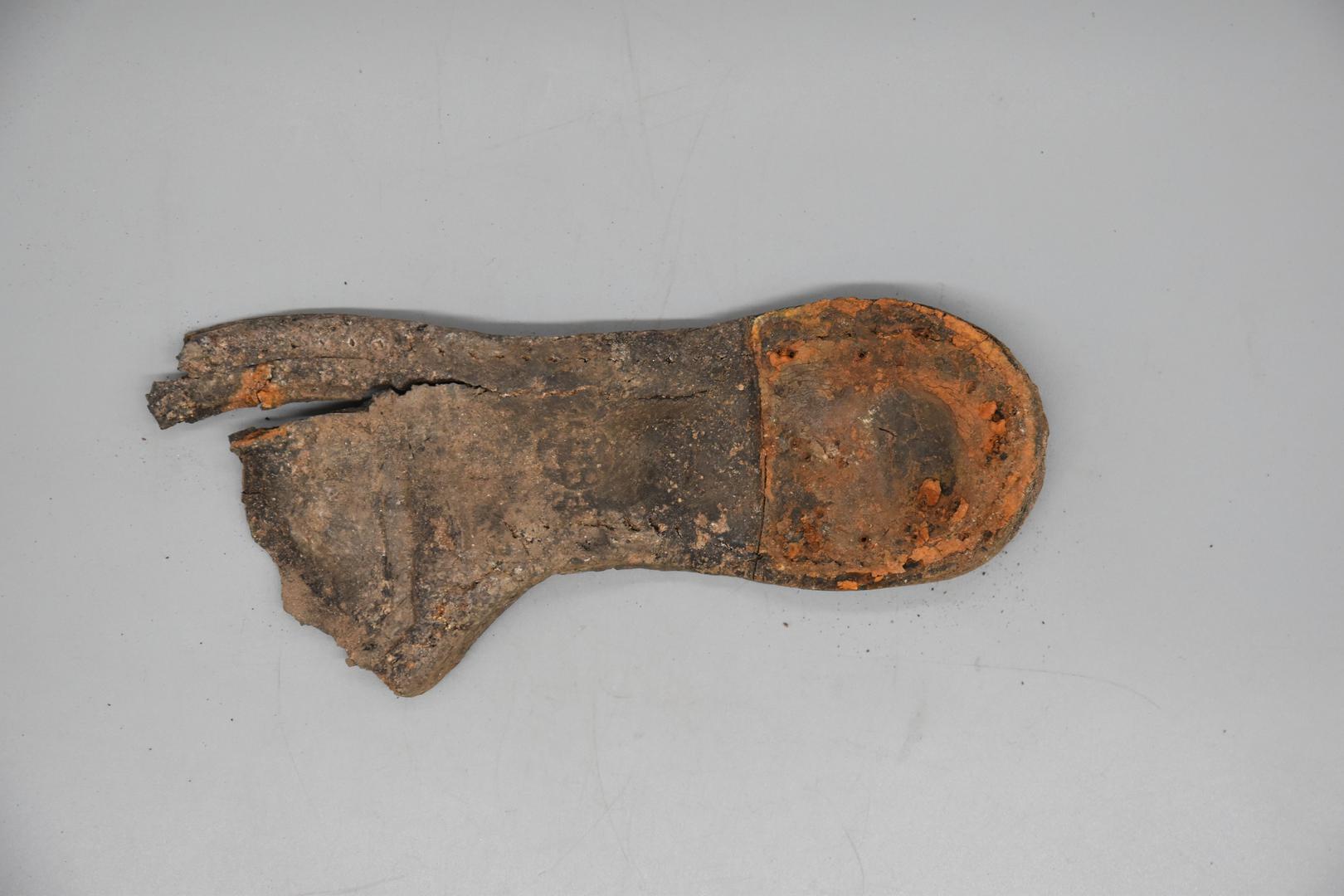 "de": "Die dunkelbraune Schuhsohle besitzt Lochungen und Nagelreste. Der Rahmen und Absatz ist erhalten. Der Vorderteil fehlt."