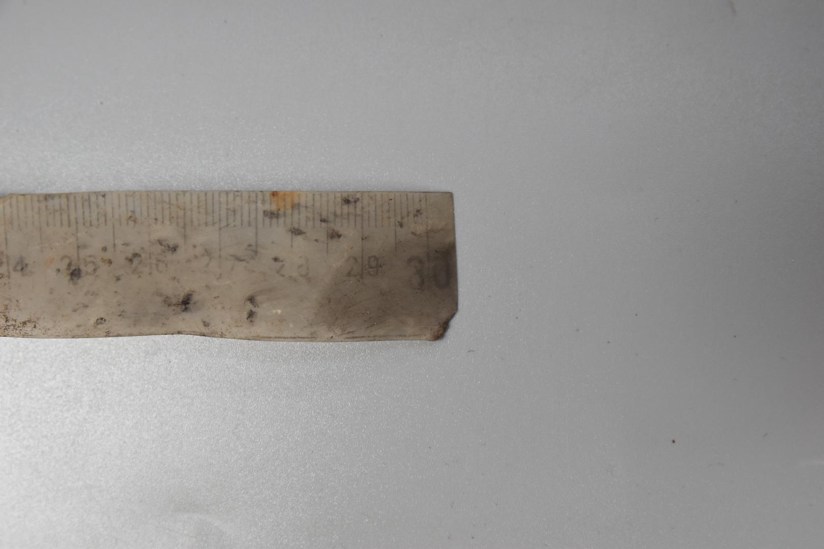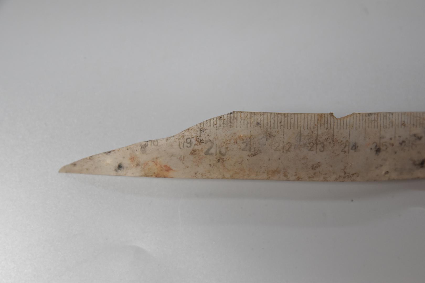 Das Lineal ist leicht verblichen und transparent. Es war ursprünglich 30 cm lang. Die Zahlen sind teilweise noch gut sichtbar. Das Lineal ist verbogen und biegsam.