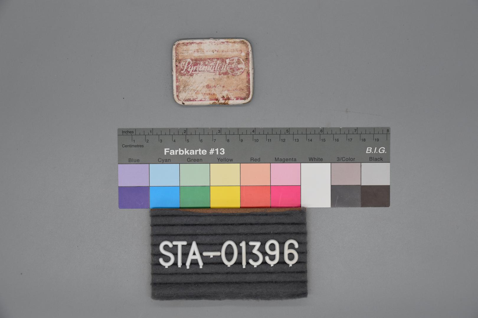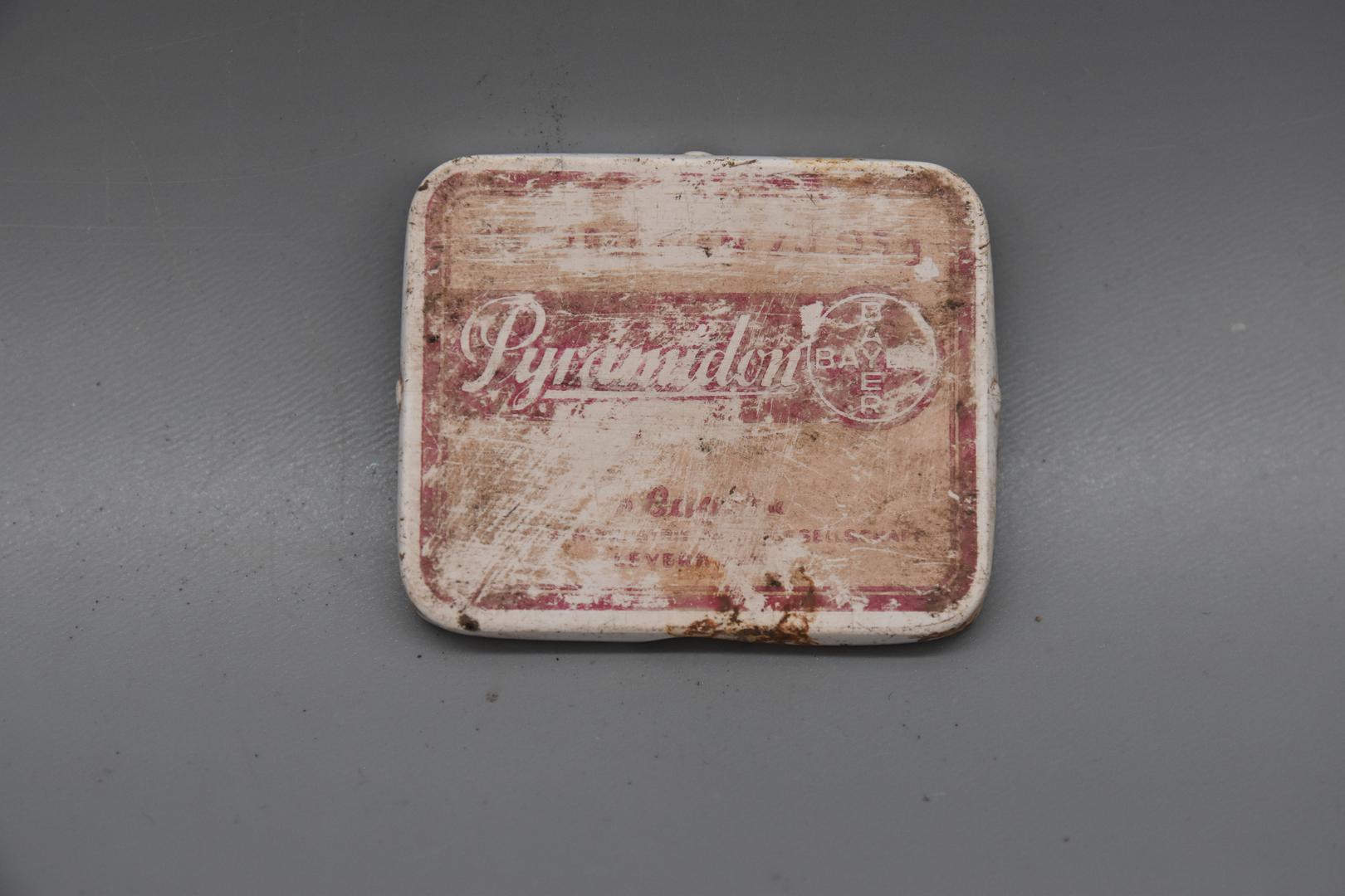 Kennzeichnung: "Pyramidon" von Bayer, anderes schwer bis fast nicht mehr lesbar. (Oberseite Deckel)
