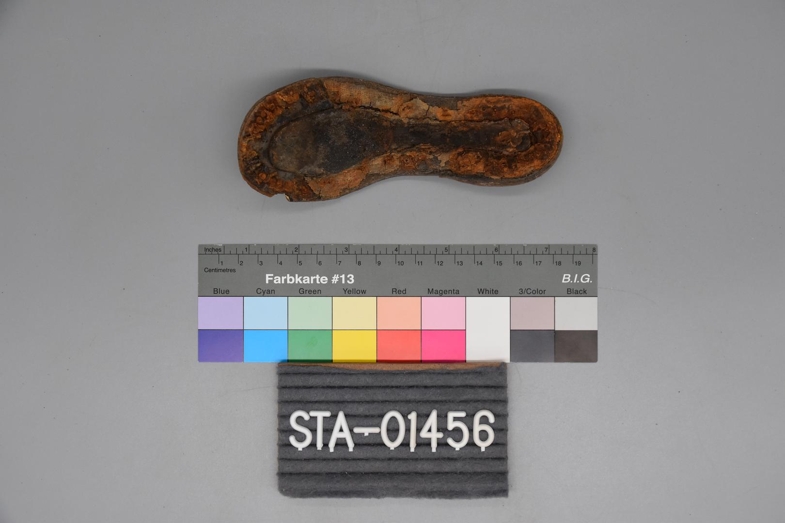 Die Gummisohle eines Kinderschuhs ist dunkelgrau. Die Sohle hat einen niedrigen Absatz. Der vordere Teil ist abgerundet und an der Sohle befinden sich noch Lederreste und Metallnägel.