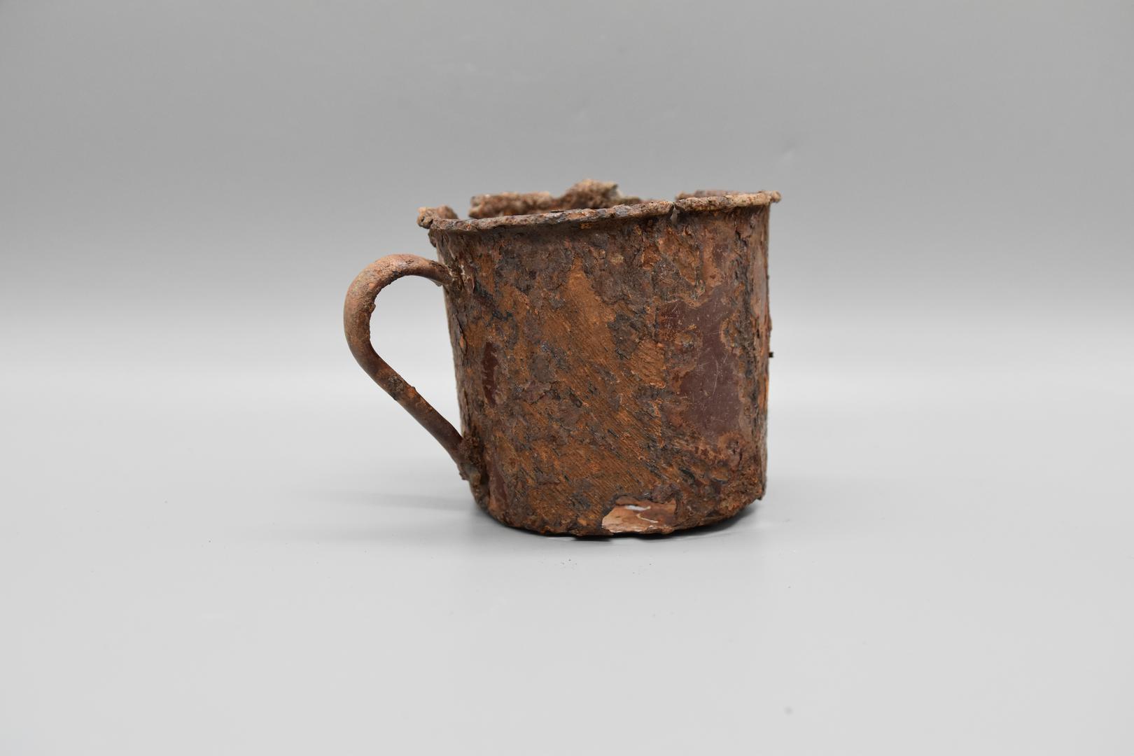 Der Krug ist zylindrisch, dunkelrot emailliert, mit einem hochgezogenem Kremprand und einem Ausguss. Am Gefäßbauch ist ein vertikaler Henkel angebracht. Am Boden ist ein hellblauer Markenstempel sichtbar.